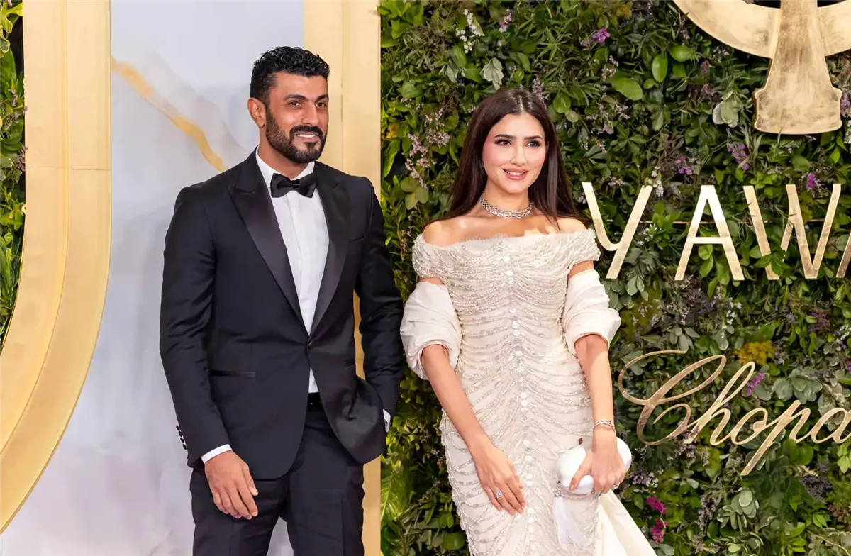 اختارت الممثلة مي عمر اللون العاجي في فستان أوف شولدر بينما ظهر زوجها محمد سامي ببدلة سوداء أنيقة مع قميص أبيض ليقدما إطلالة متناسقة وراقية.