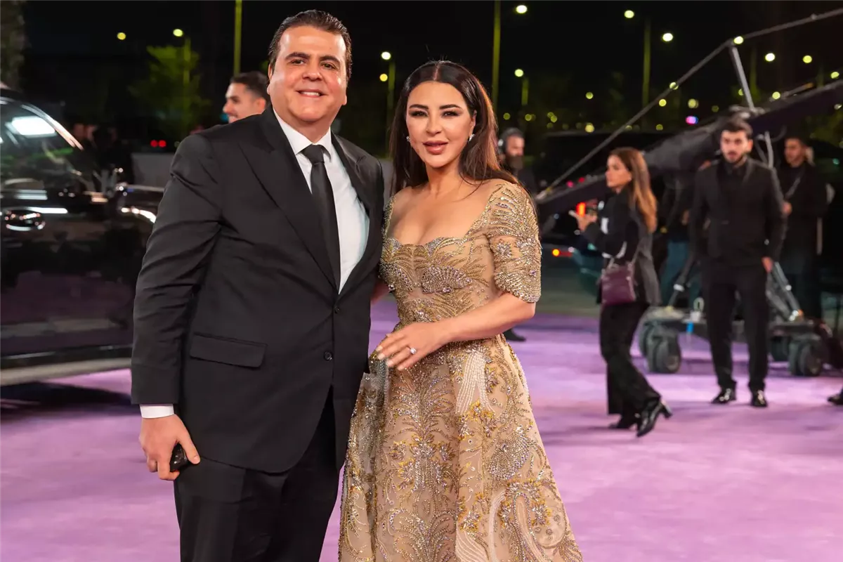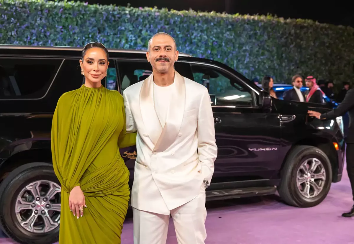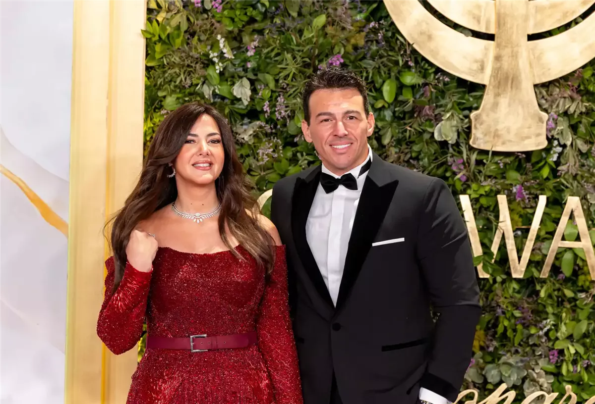 تألقت الفنانة دنيا سمير غانم بفستان أحمر بينما اختار زوجها رامي رضوان بدلة سوداء كلاسيكية ليقدما إطلالة متناسقة وجذابة على السجادة البنفسجية.