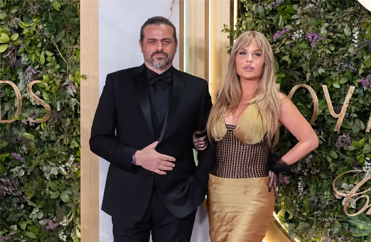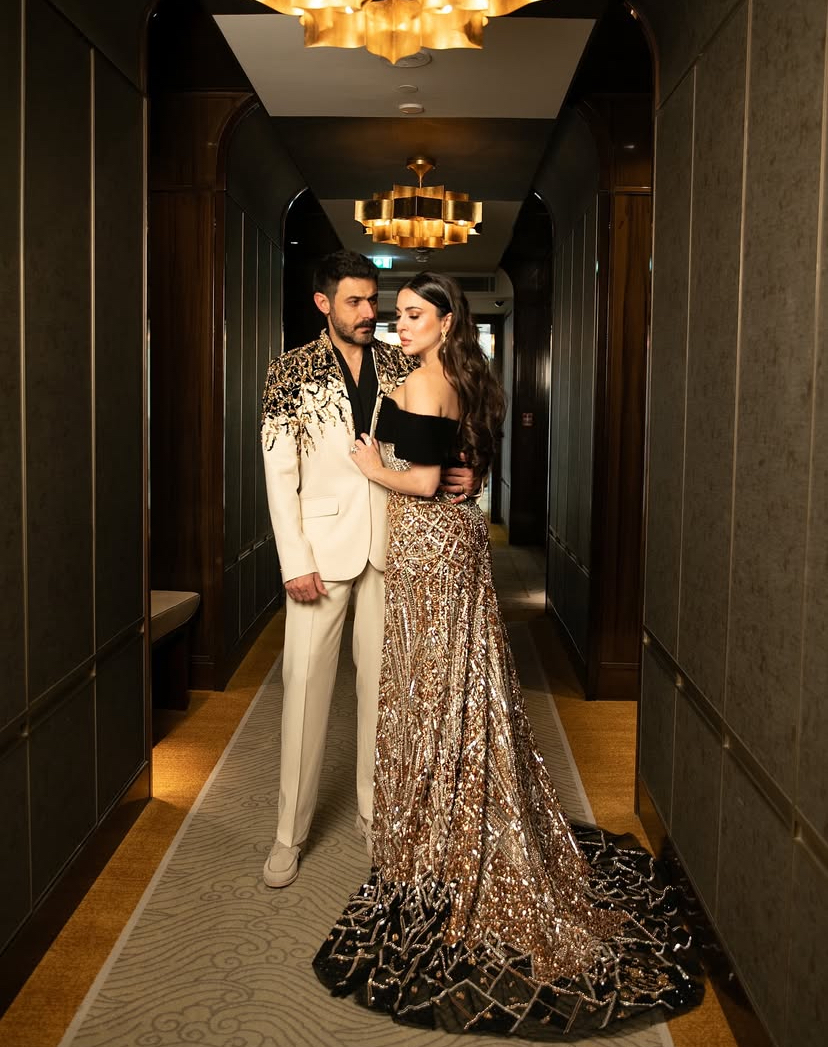 خطفت الفنانة نيكول سابا الأنظار بفستان ذهبي وأسود فاخر بينما ظهر زوجها يوسف الخال ببدلة سوداء كاملة في ثنائي جمع بين الفخامة والأناقة.