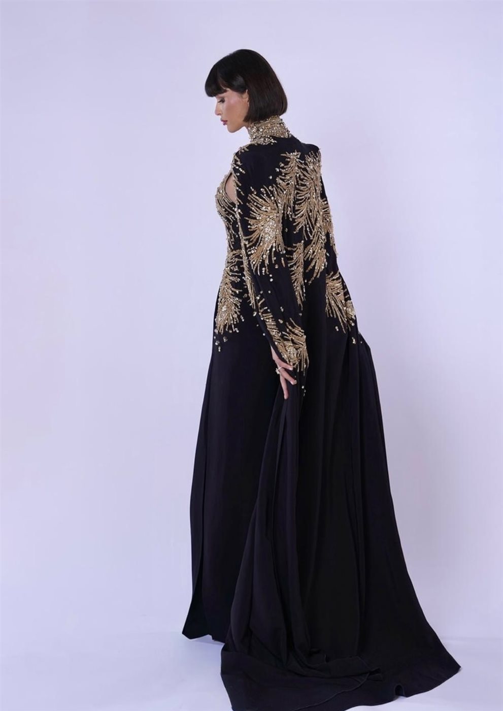 ارتدت عزة سليمن فستانًا أسود طويلًا من مجموعة الكوتور لخريف 2025، تميّز بقصّة منحوتة أبرزت القوام بأسلوب أنيق ومتوازن. الفستان جاء مزينًا بتطريزات ذهبية كثيفة عند الجزء العلوي، صُممت بدقة عالية لتعكس براعة الحرفية التي يشتهر بها زهير مراد. هذا التداخل بين الأسود العميق والذهب اللامع أضفى على الإطلالة طابعًا ملكيًا لافتًا، جعلها واحدة من أكثر الإطلالات حضورًا على السجادة البنفسجية.