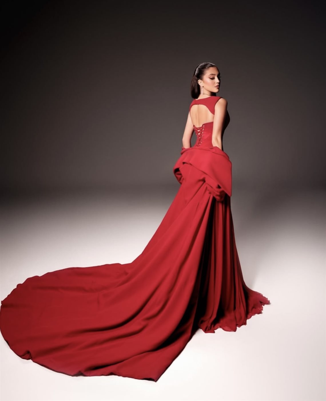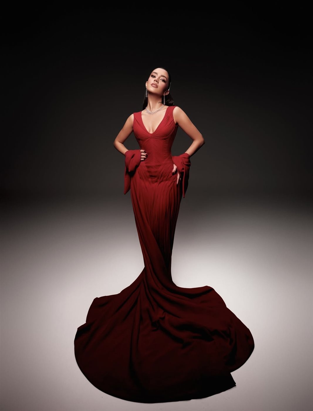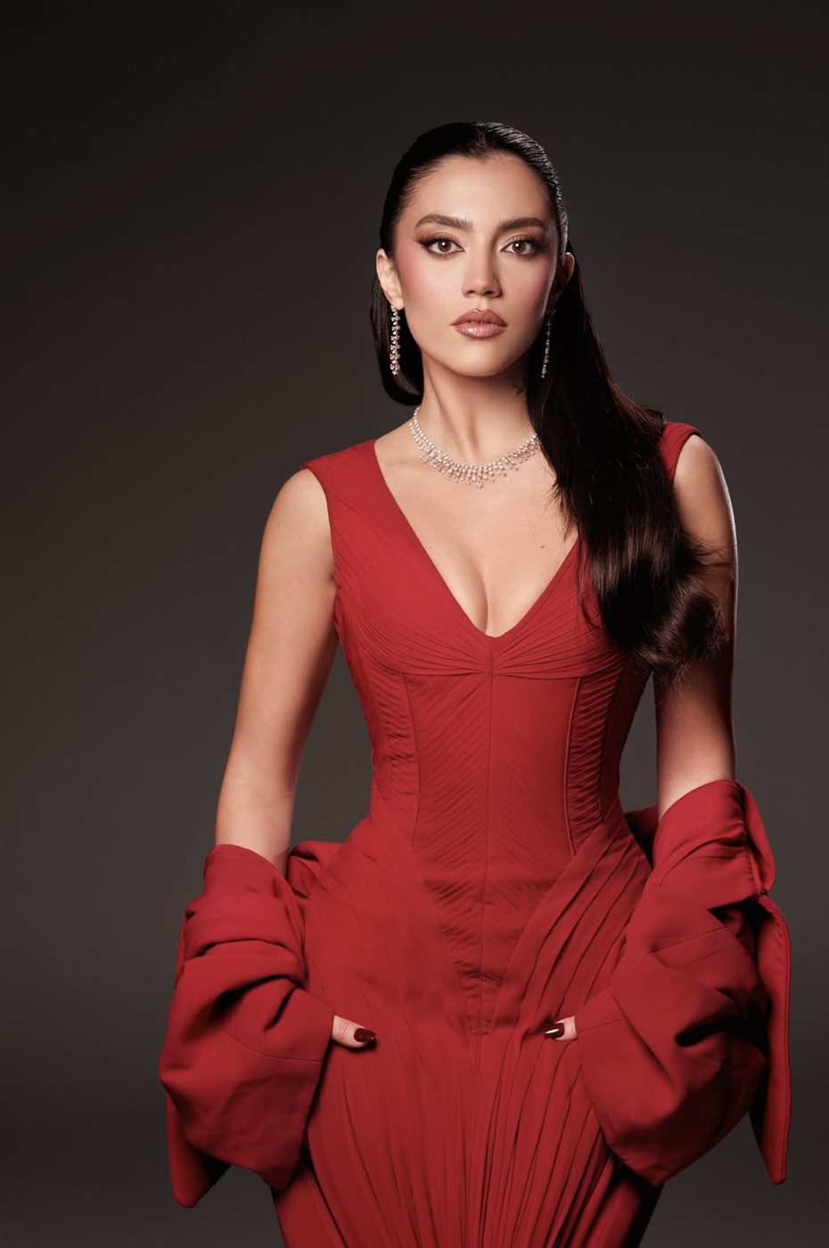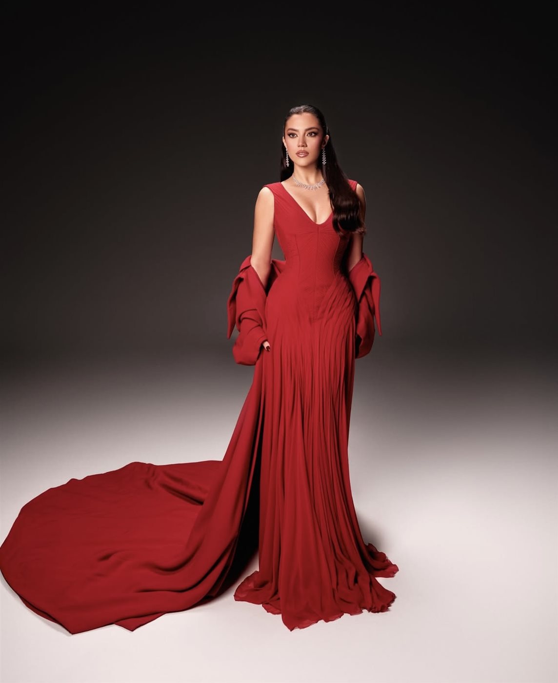 اختارت ستيفاني عطا الله اللون الأحمر، وهو لون يحمل دلالات القوة والشغف والثقة، فجاء الفستان ليعكس شخصيتها الفنية وحضورها القوي. التصميم تميّز بقصّة أنثوية دقيقة أبرزت القوام بانسيابية راقية، مع فتحة صدر على شكل حرف V أضفت لمسة كلاسيكية جريئة في آنٍ واحد. الثنيات الناعمة في القماش منحت الفستان حركة وانسيابًا، بينما انسدل الذيل الطويل خلفها ليضفي طابعًا دراميًا أنيقًا، يليق بحفل بحجم Joy Awards.