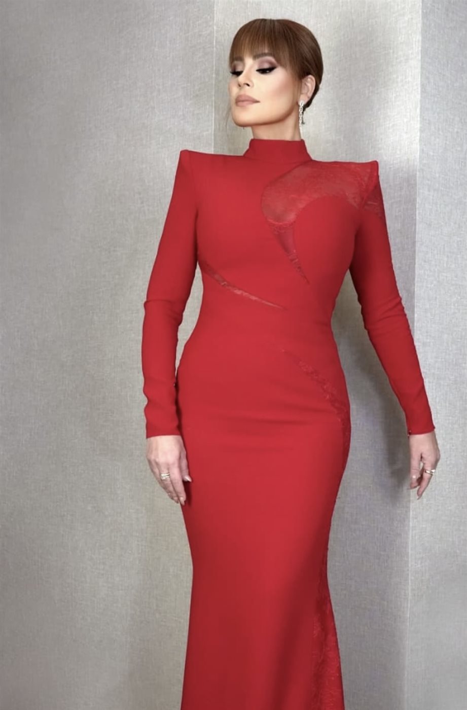 الفستان جاء باللون الأحمر القاني، وهو لون يعكس الثقة والقوة والشغف، وصُمم بقصّة أنثوية دقيقة أبرزت القوام بأسلوب راقٍ بعيد عن المبالغة. التصميم تميّز بياقة مرتفعة وأكتاف محددة أضفت على الإطلالة طابعًا عصريًا قويًا، فيما جاءت القصّة مستقيمة وانسيابية، لتمنح الفستان حضورًا أنيقًا ومتوازنًا. أما التفاصيل الشفافة الناعمة عند منطقة الصدر والخصر، فقد أضافت لمسة جريئة مدروسة، عززت من جاذبية التصميم من دون الإخلال برقيه.