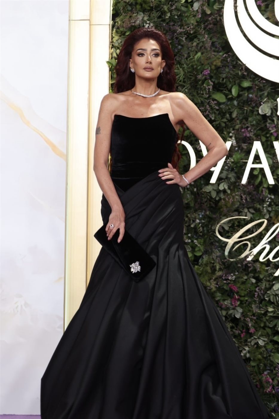 اختارت غادة فستانًا أسود بتصميم كلاسيكي راقٍ، جاء بقصّة مكشوفة الكتفين أبرزت أنوثتها بأسلوب ناعم ومتزن، بينما انسدل الفستان من الأسفل بقصّة واسعة أضفت عليه طابعًا دراميًا أنيقًا. القماش بدا فخمًا بانسيابيته وحركته، ما منح الإطلالة حضورًا قويًا على السجادة، خاصة مع بساطة التصميم التي سمحت للتفاصيل أن تتحدث عن نفسها.