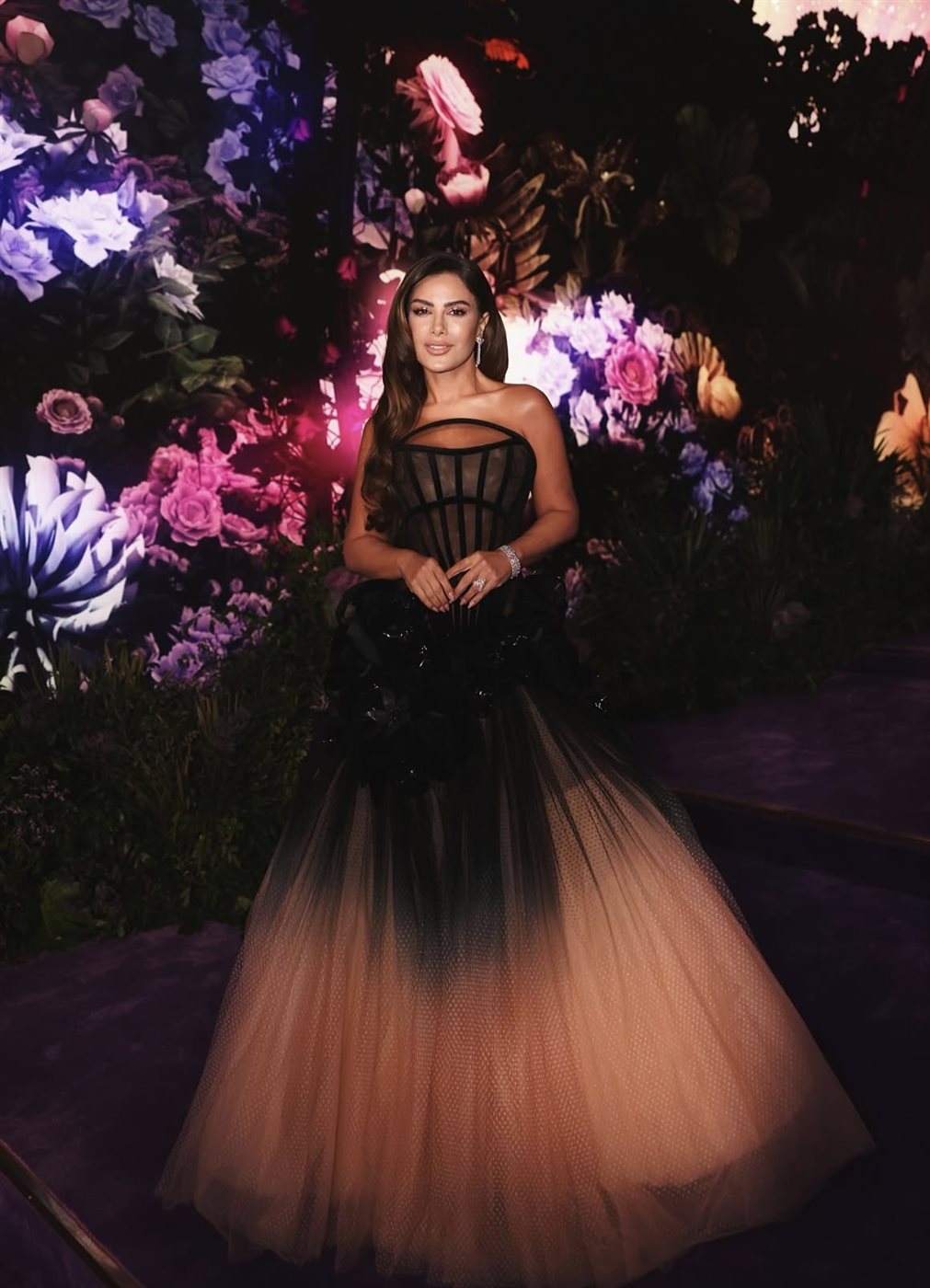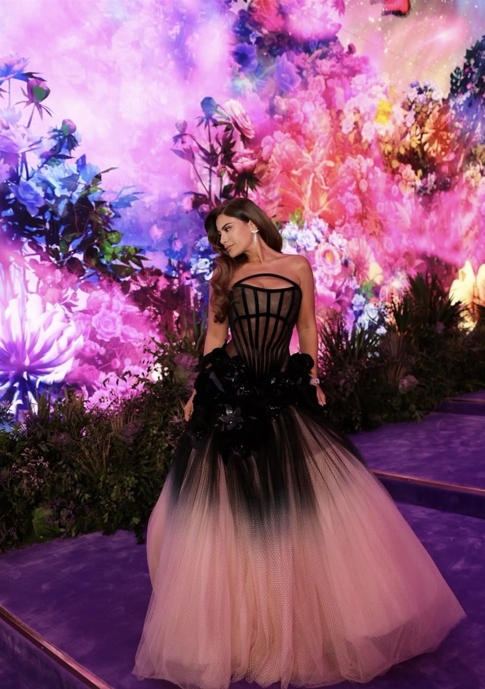 اللافت في الإطلالة هو هذا التناقض المدروس بين الصلابة والنعومة، بين الجرأة الكلاسيكية والرومانسية الحديثة، وهو ما جعل الفستان يبدو كقطعة فنية تنتمي إلى السجادة الحمراء العالمية. اختيار القماش والتدرج اللوني انسجم تمامًا مع خلفية الحفل المليئة بالألوان والزهور، ليخلق صورة بصرية متكاملة لاقت تفاعلًا واسعًا.