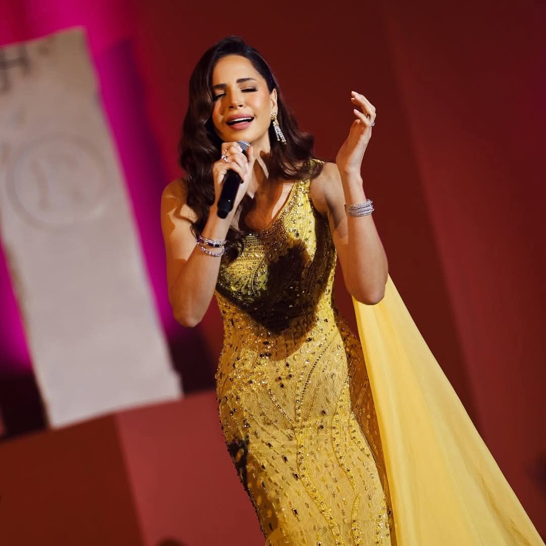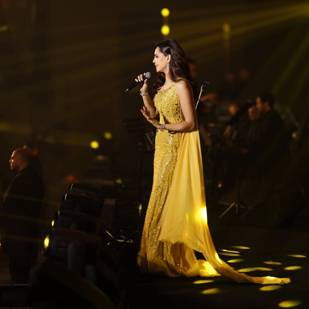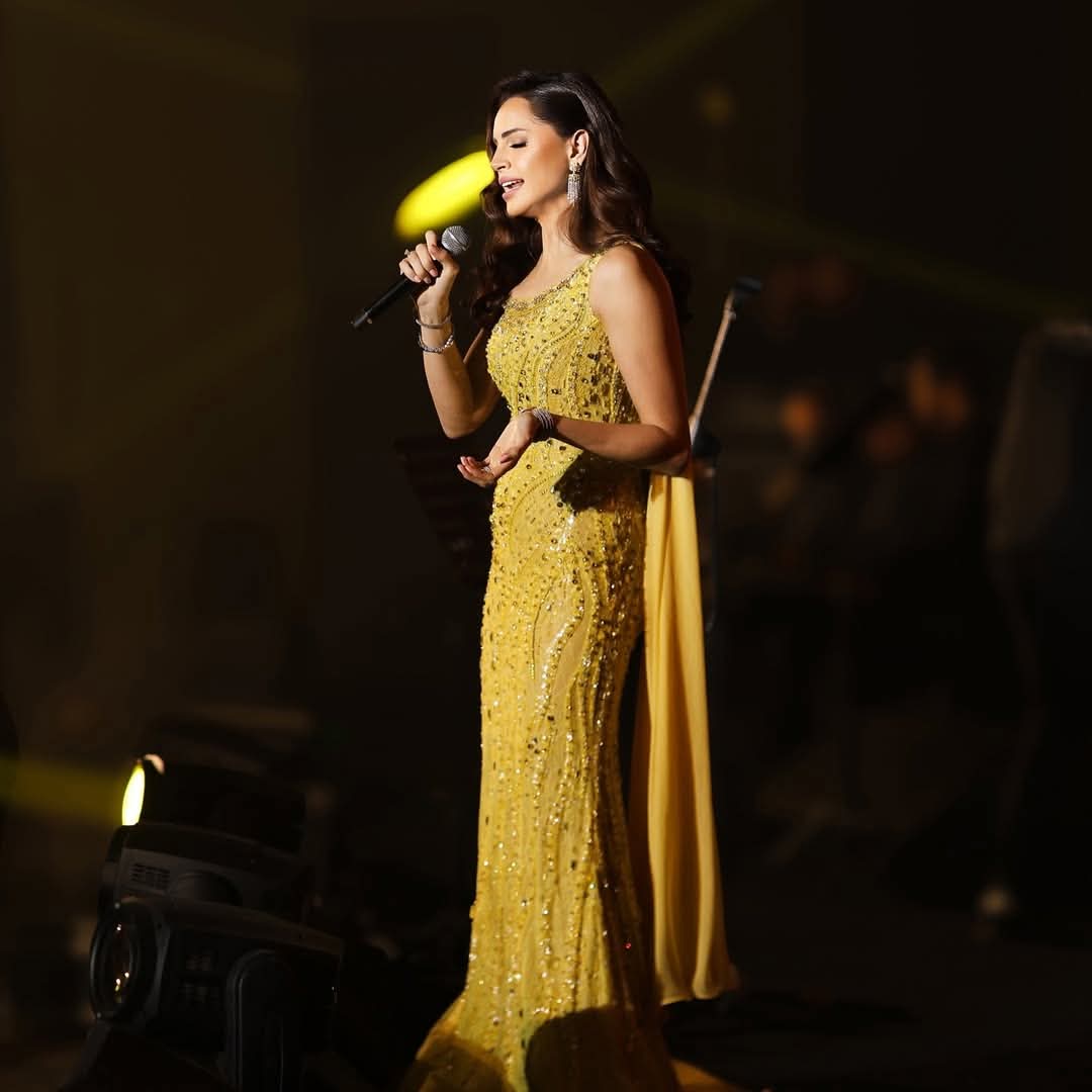 آمال ماهر تتألق بإطلالة صفراء جريئة بتوقيع رامي سلمون
