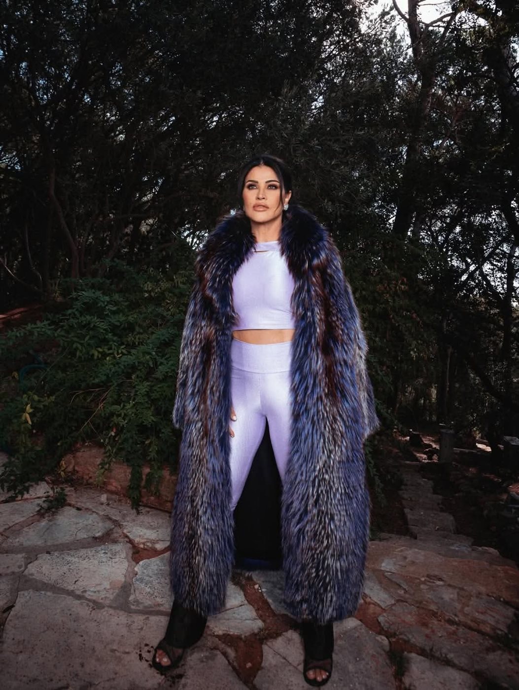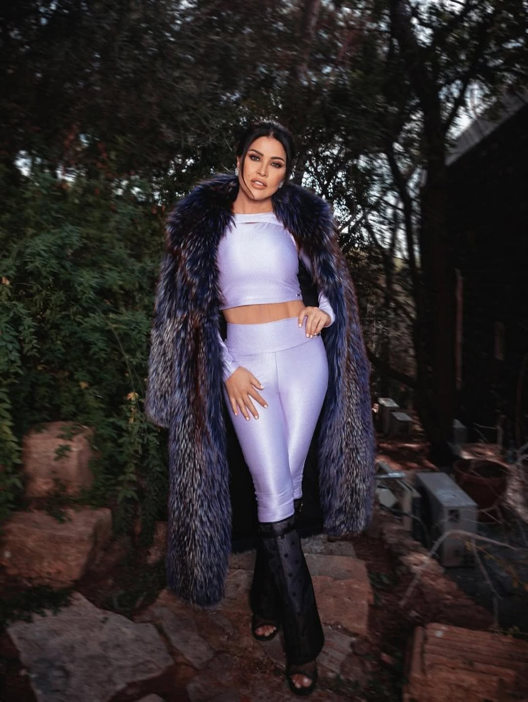 لكن جومانا لم تكتفِ بهذا الهدوء، بل كسرت رتابة الساتان بمعطف فرو طويل شكّل العنصر الأكثر جرأة في الإطلالة.
