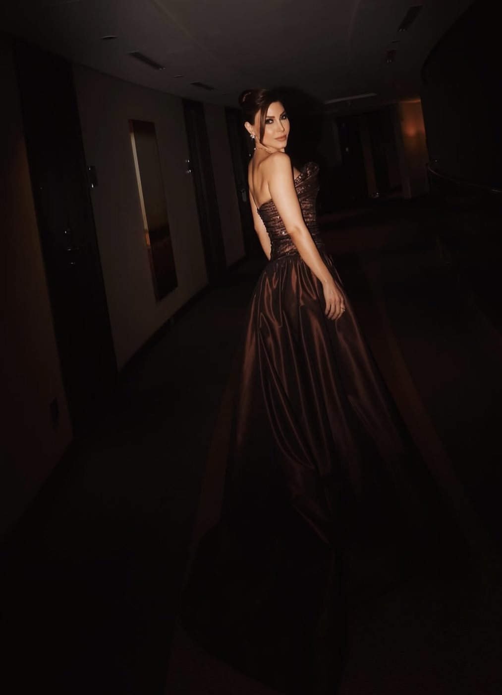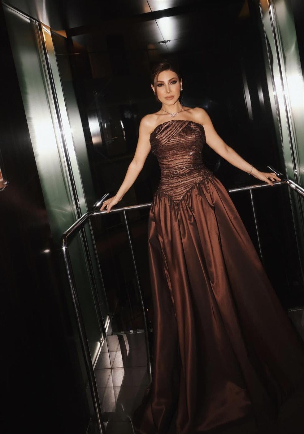 تألقت يارا بفستان طويل باللون البني، لون دافئ وعميق يعكس رقيًا بعيدًا عن المبالغة، ويُعد من الألوان اللافتة في الإطلالات المسائية المعاصرة. التصميم جاء أنثويًا بانسياب واضح، مع خامة لامعة تعكس الإضاءة بشكل ناعم، ما أضفى على الفستان بعدًا دراميًا راقيًا، خاصة في اللقطات المصورة داخل مصعد ذي جدران عاكسة، لعب دورًا مهمًا في إبراز التفاصيل ومنح الصور طابعًا سينمائيًا.