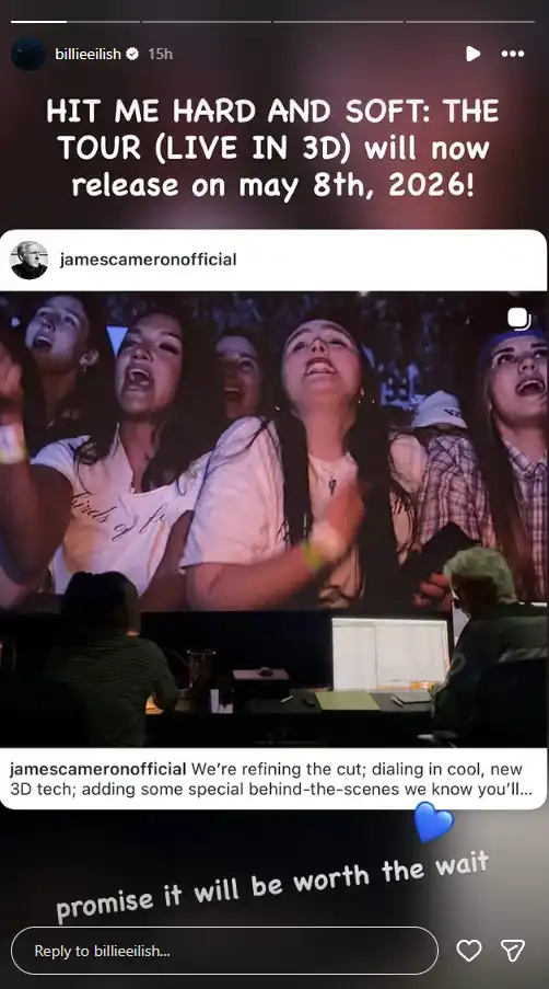 HIT ME HARD AND SOFT: THE TOUR (LIVE IN 3D) ليعرض يوم الجمعة 8 مايو المقبل بدلا من نهاية مارس بحسب ما أعلنه كاميرون عبر حسابه الرسمي.