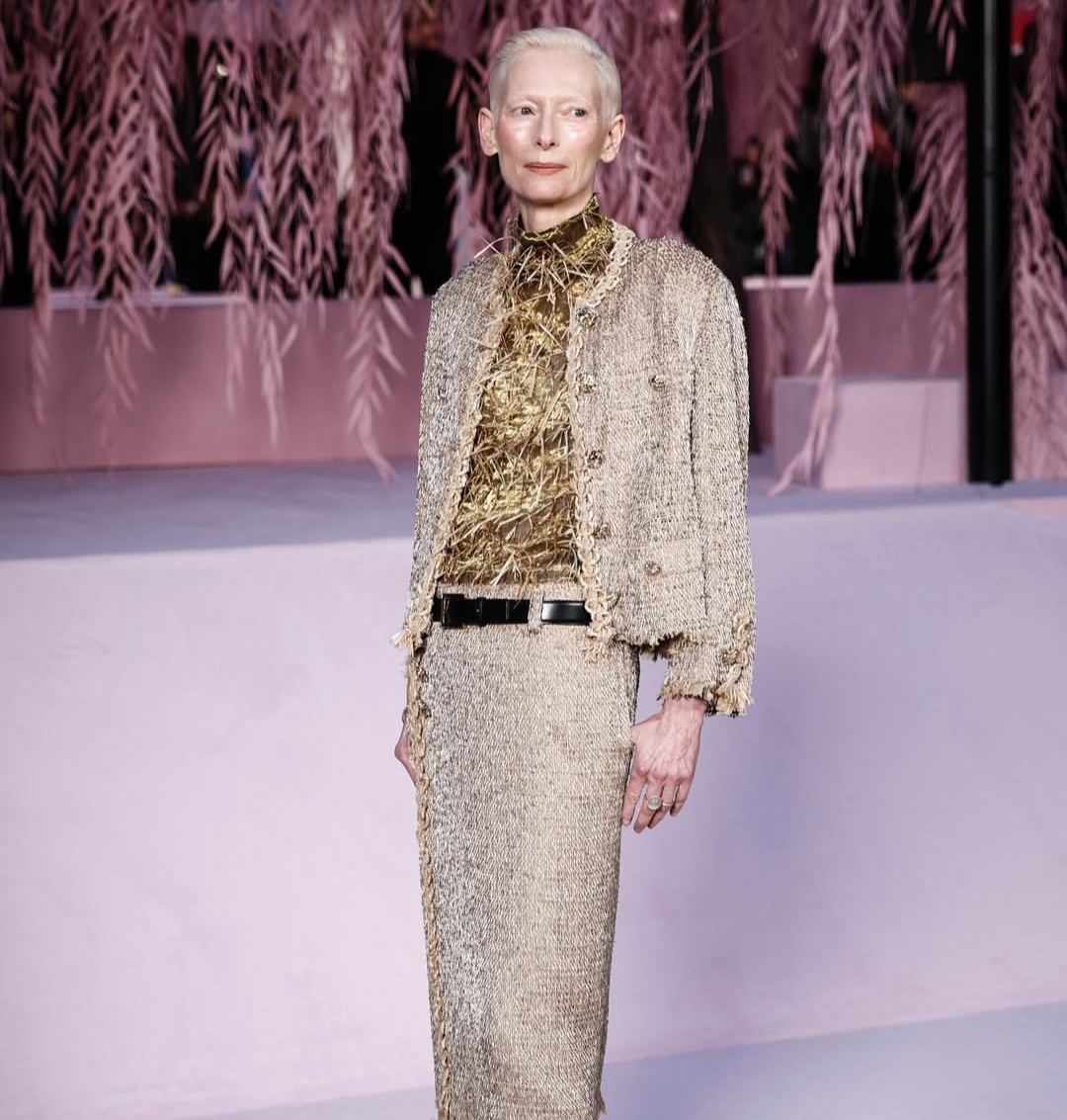 أما الأيقونة البريطانية تيلدا سوينتون، فقد اختارت الوفاء لإرث "شانيل" العريق من خلال "التويد" (Tweed)، حيث ظهرت بإطلالة أنيقة جسدت الرقي البريطاني الممتزج باللمسة الفرنسية، مؤكدة أن قماش التويد يظل قطعة عصية على الزمن مهما تغيرت المواسم.