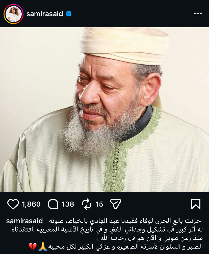حرصت الفنانة المغربية الكبيرة سميرة سعيد على نعي مواطنها الفنان القدير عبد الهادي بلخياط الذي رحل عن عالمنا خلال الساعات القليلة الماضية بعد صراع مع المرض تاركا خلفه إرثا فنيا خالدا في ذاكرة الأغنية المغربية.