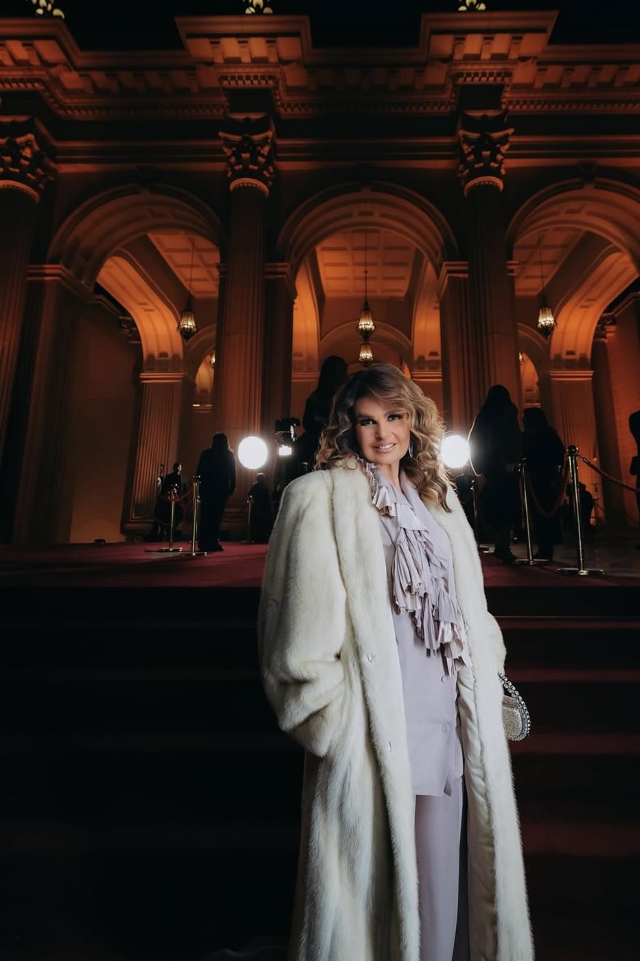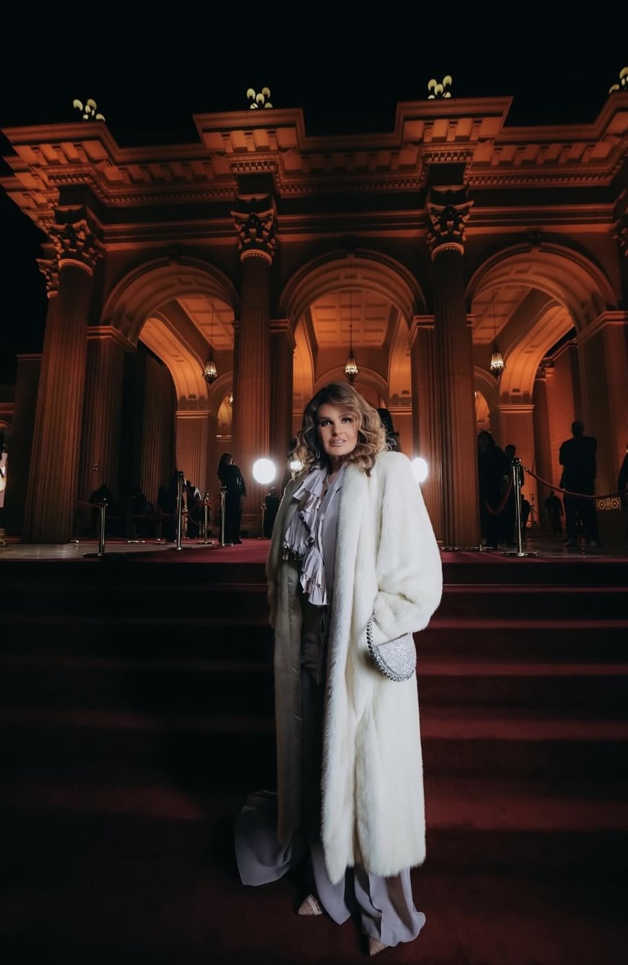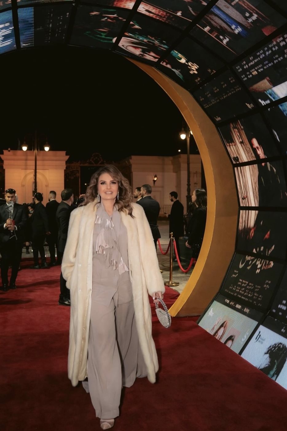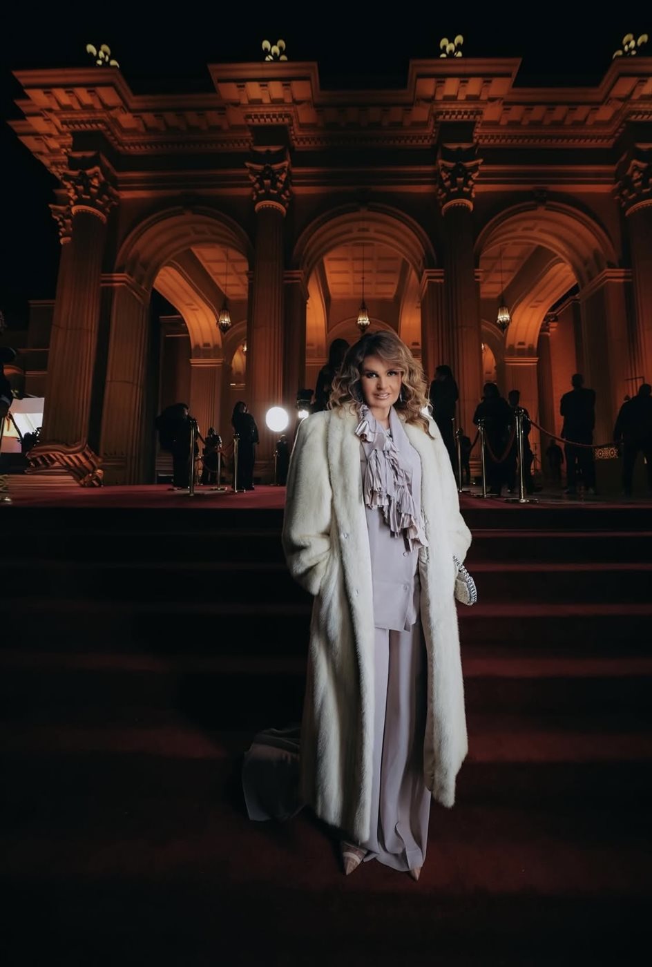 اختارت يسرا إطلالة تعتمد على درجات محايدة هادئة، جاءت متناغمة مع أجواء الحدث الليلية ومعمار المكان الكلاسيكي الفخم. اللوك ارتكز على معطف طويل باللون العاجي من توقيع دار ألبيرتا فيريتي، أضفى حضورًا فخمًا ودافئًا في آن واحد، وجاء مفتوحا ليكشف عن إطلالة داخلية ناعمة تميل إلى درجات البيج والرمادي الفاتح. هذا التناسق اللوني منح الإطلالة هدوءًا بصريًا وأناقة خالدة، بعيدا عن الصخب أو المبالغة.