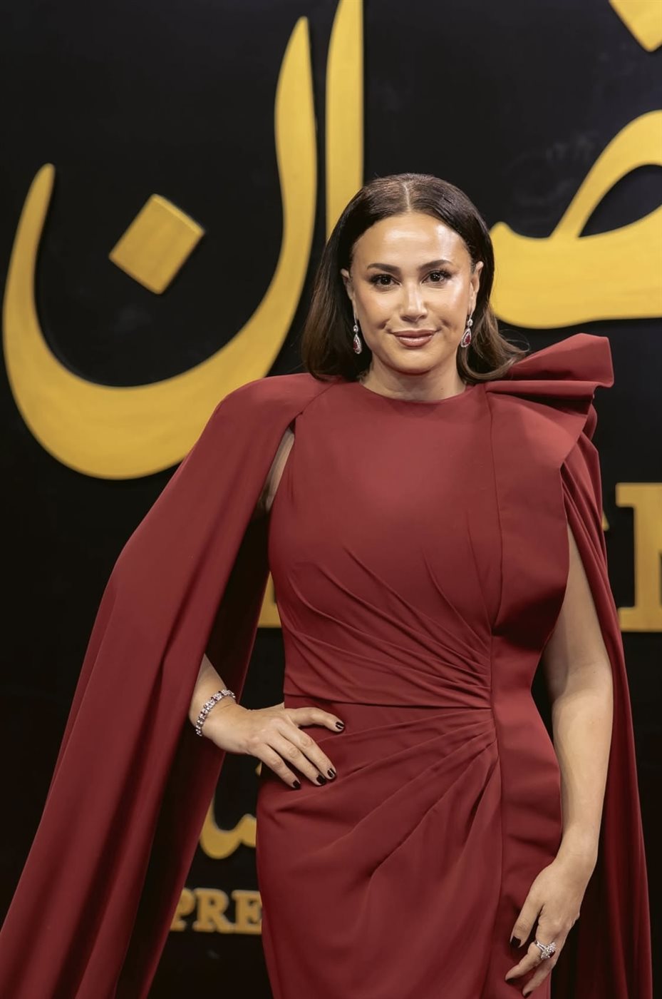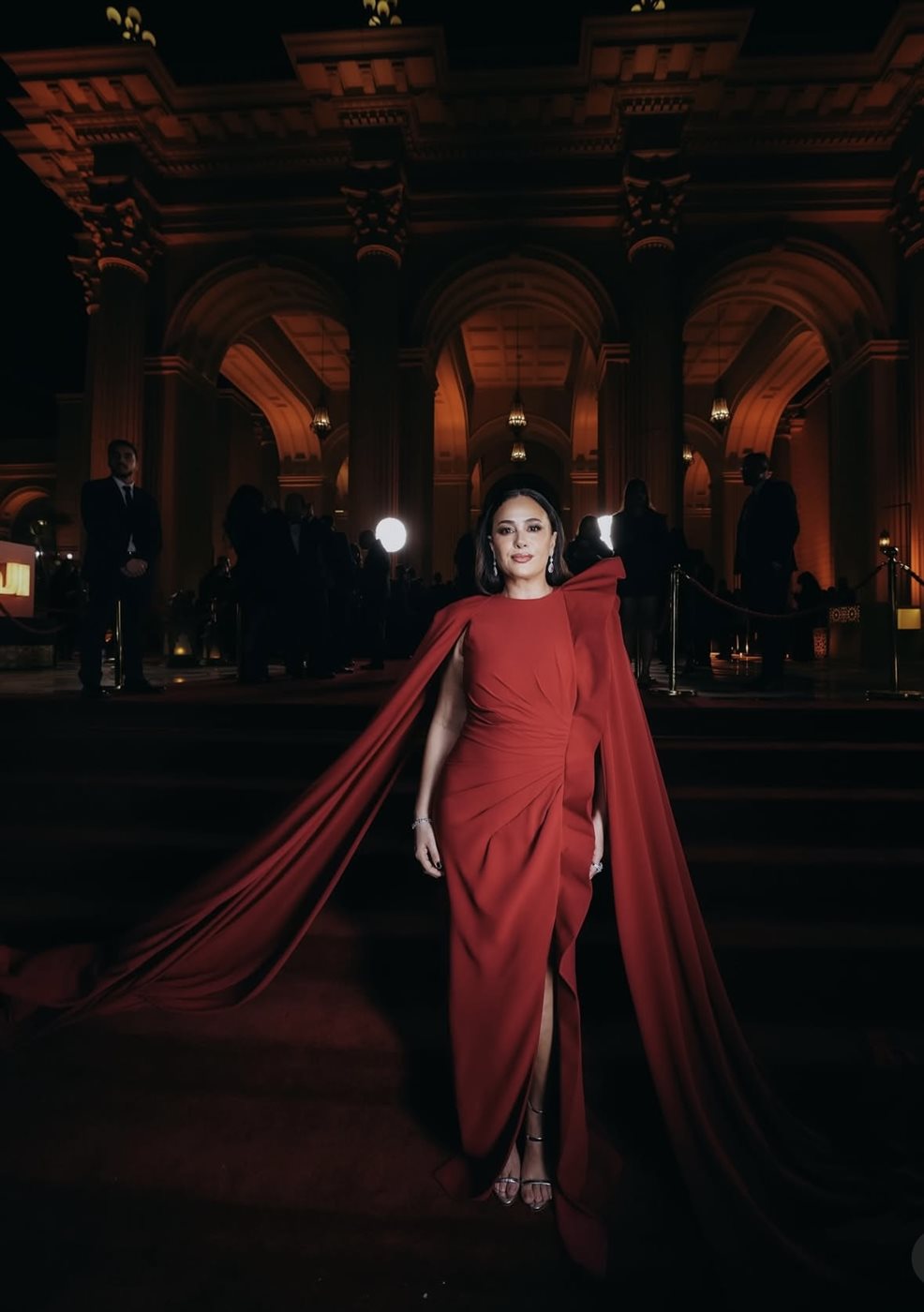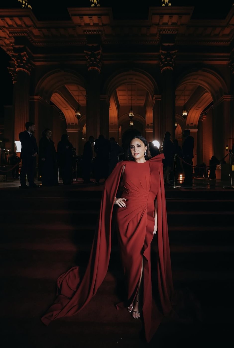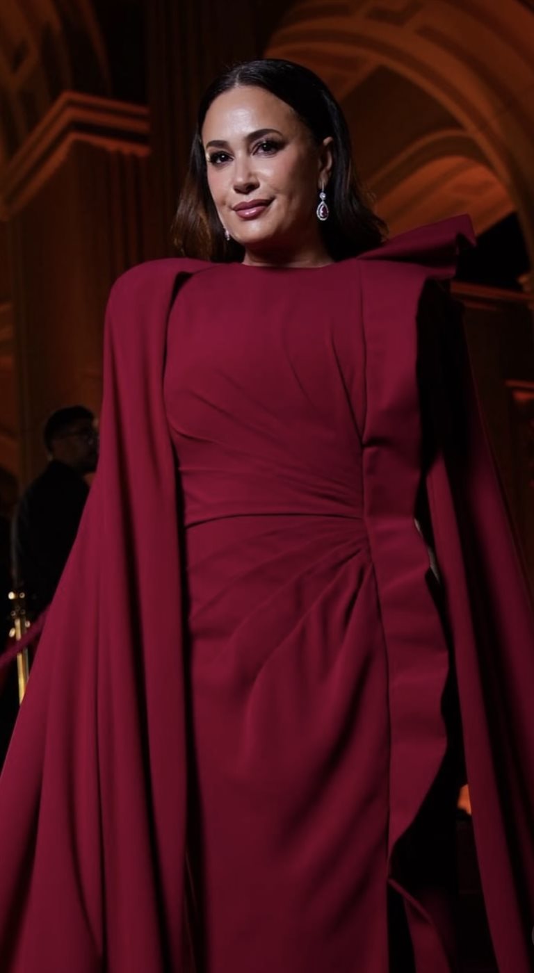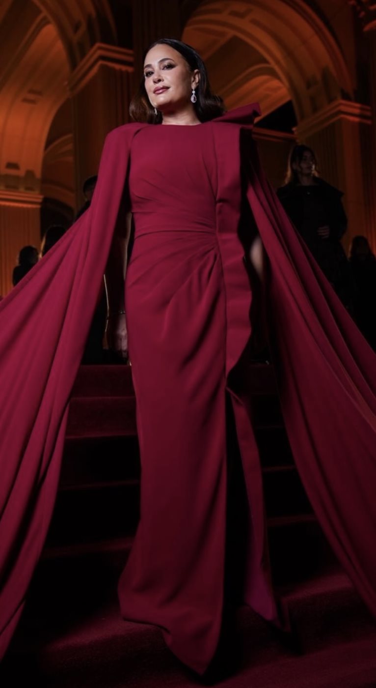 اختارت هند فستانًا باللون الأحمر الداكن من توقيع Tony Ward Couture، وهو لون يحمل دلالات القوة والأنوثة في آن واحد، ويتناغم بشكل لافت مع أجواء المكان المعماري المهيب وإضاءة السهرة الدافئة. التصميم جاء بقصة طويلة تنسدل بانسيابية، مع كاب درامي ينساب خلفها ليمنح الإطلالة بعدًا مسرحيًا فخمًا دون مبالغة. التفاصيل الدقيقة في الثنيات والقصّة الجانبية أظهرت براعة التصميم في إبراز القوام بأسلوب راقٍ، بعيد عن أي استعراض مباشر، وهو ما ينسجم تمامًا مع شخصية هند التي تفضل دائمًا الأناقة الهادئة ذات التأثير العميق.