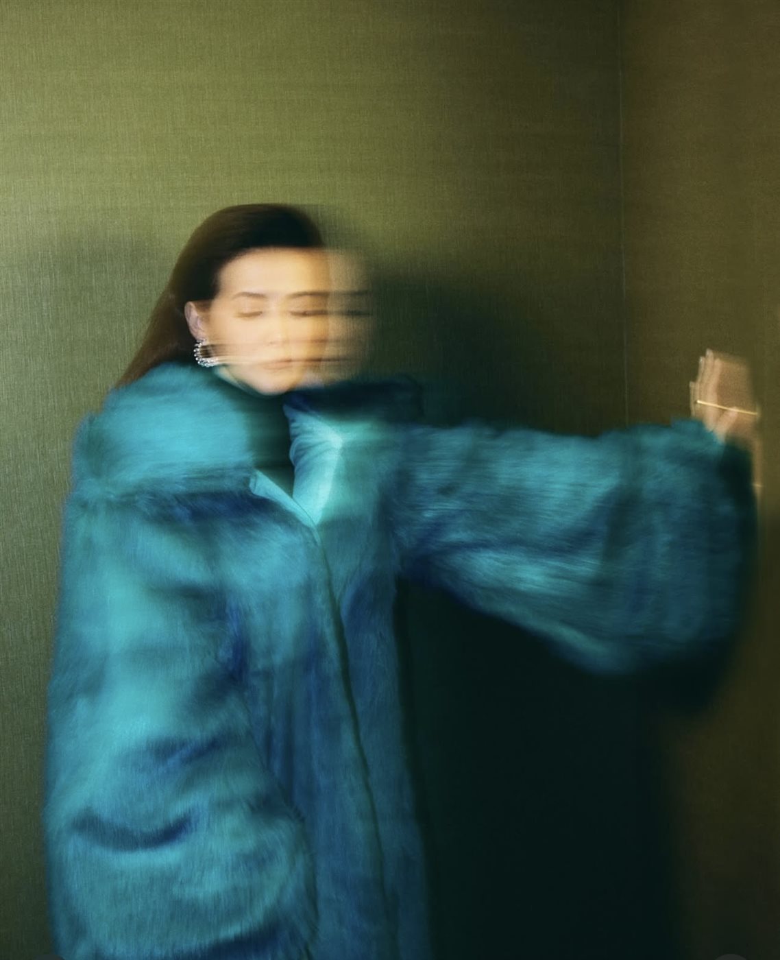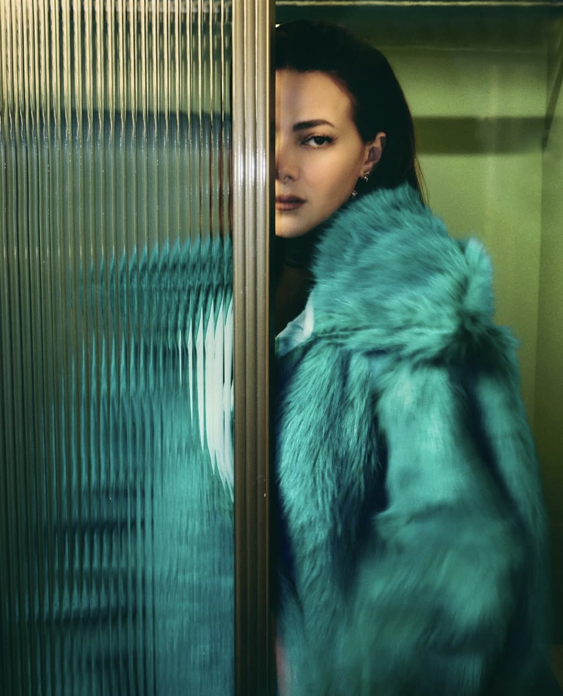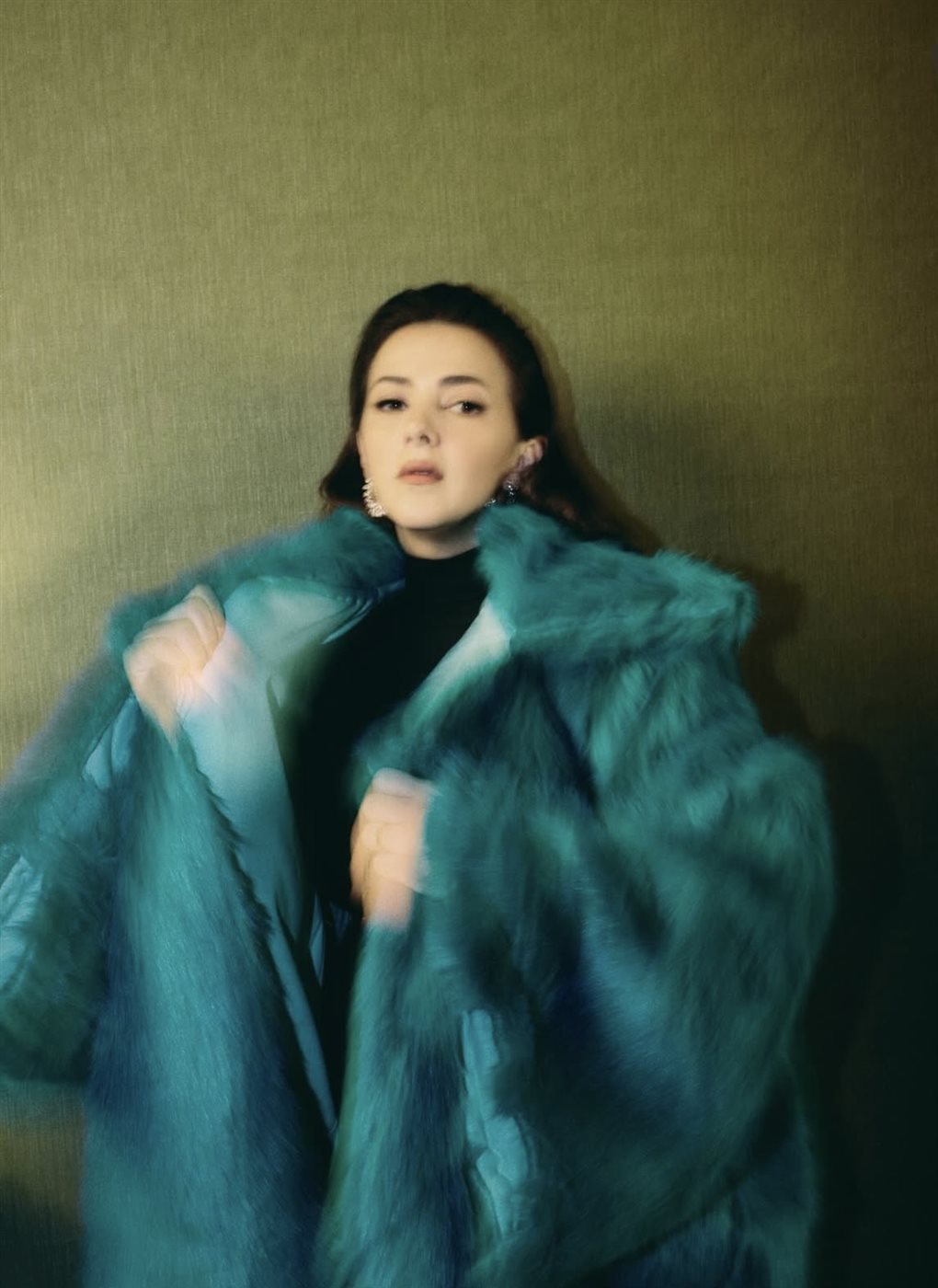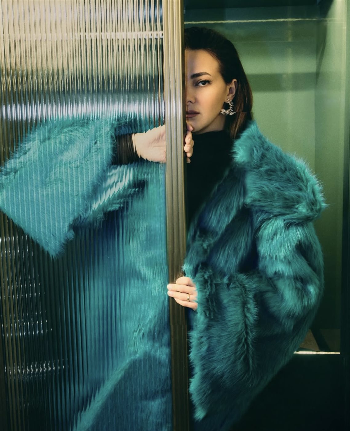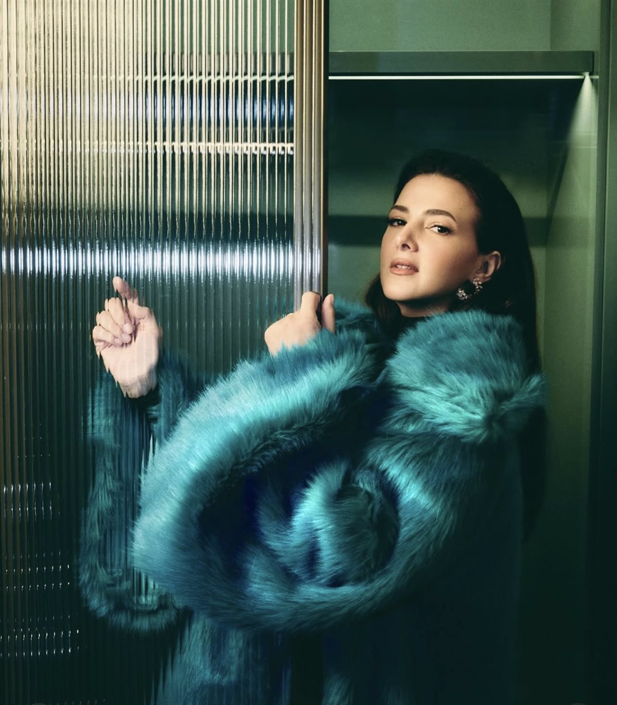 اختارت دنيا إطلالة جريئة وناعمة في الوقت نفسه، تمثلت في معطف فرو باللون الأزرق المائل إلى الأخضر من Helsa Studio، وهو لون غير تقليدي يعكس إحساسًا بالتميز والاختلاف، ويمنح الإطلالة طابعًا عصريًا لافتًا. المعطف جاء بتصميم واسع وانسيابي، ما أضفى على الصور حركة وحيوية، خاصة مع اعتماد بعض اللقطات على الإحساس بالحركة وعدم الثبات، ليبدو اللوك وكأنه مشهد سينمائي أكثر منه جلسة تصوير تقليدية. أسفل المعطف، اعتمدت دنيا على قطعة سوداء بسيطة، ما خلق توازنًا بصريًا ذكيًا، وسمح للون المعطف بأن يكون بطل الإطلالة دون منافسة.