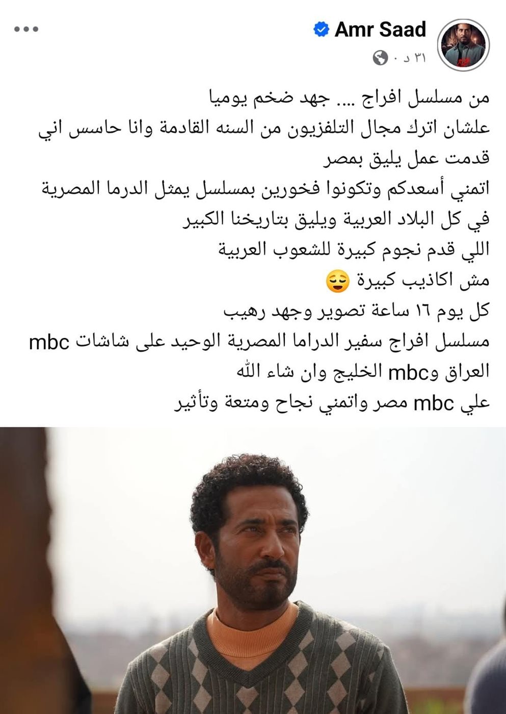 وأضاف خلال منشوره، قائلا: “كل يوم 16 ساعة تصوير وجهد رهيب، مسلسل إفراج سفير الدراما المصرية الوحيد على شاشات mbc العراق وmbc الخليج وأن شاء الله على mbc مصر وأتمنى نجاح ومتعة وتأثير”.