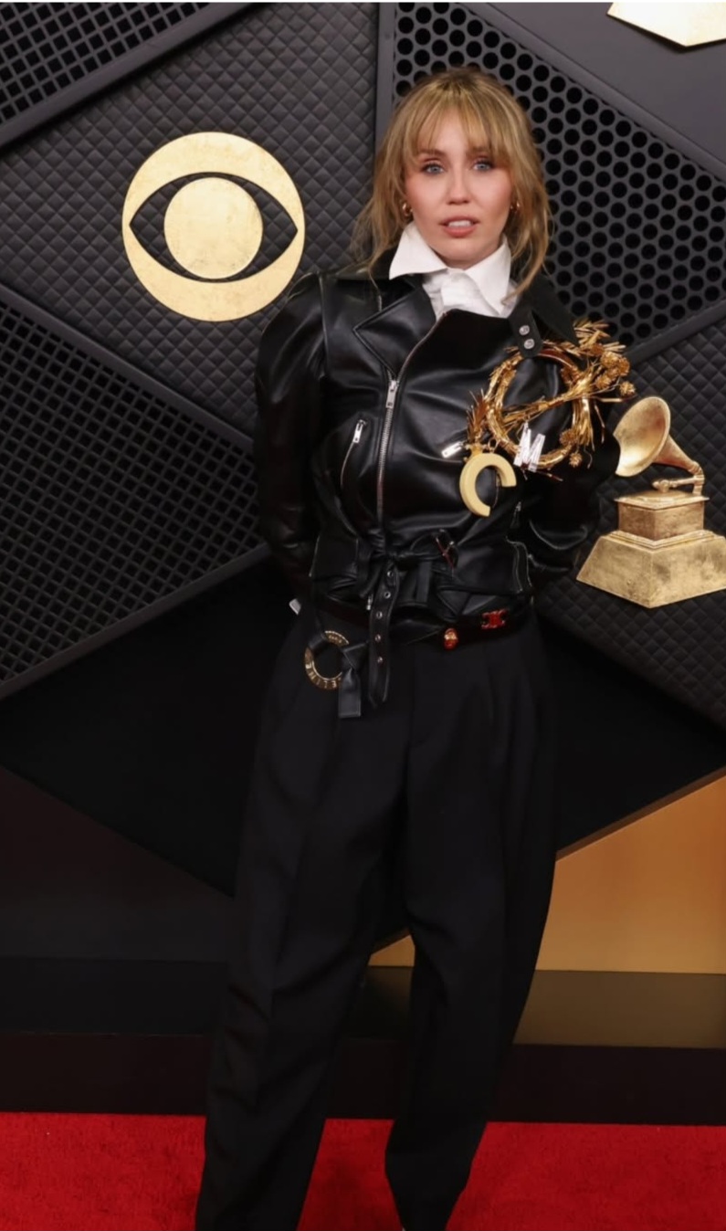 ولإكمال اللوك بأسلوب edgy جريء، اعتمدت سايرس سترة جلدية قصيرة من توقيع دار Celine العالمية، جاءت مزينة بتفاصيل معدنية باللون الذهبي، أضافت بعدًا فنيًا لافتًا للإطلالة، وجعلتها أقرب إلى قطعة فنية معاصرة تعكس روح الحدث وضخامته.