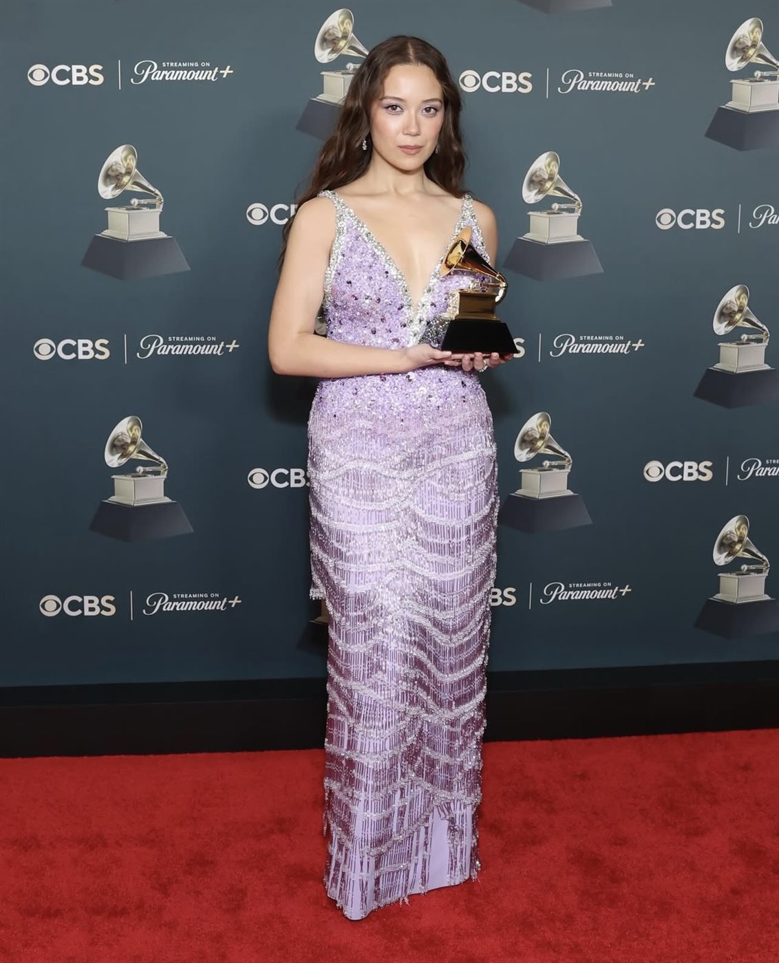 اللون البنفسجي، المعروف بدلالاته المرتبطة بالإبداع والرقي، بدا اختيارًا موفقًا يعكس طبيعة موسيقى Laufey التي تمزج بين الرومانسية والعمق العاطفي. التطريز الكامل للفستان عكس حرفية عالية، بينما جاءت القصة متوازنة بين الكلاسيكية والبساطة، ما جعل الإطلالة واحدة من أكثر الإطلالات تميزًا في تلك الأمسية.