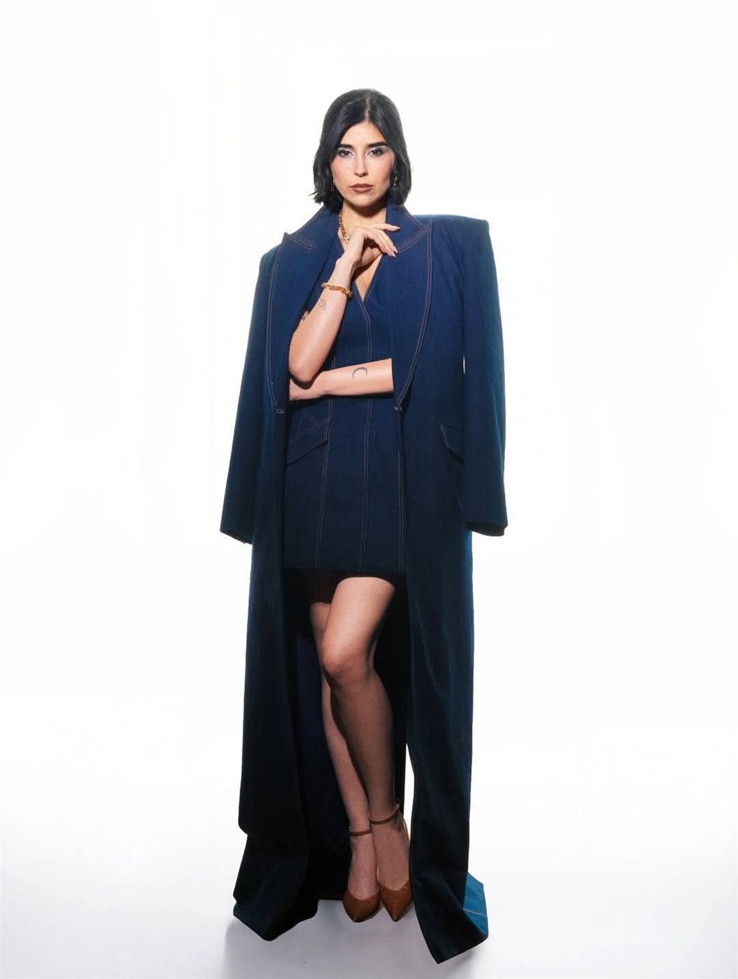ولإكمال الإطلالة، نسّقت زينة مع الفستان معطفًا واسعًا باللون الكحلي، أضفى لمسة من الفخامة والاتزان على اللوك العام، وخلق توازنًا بصريًا بين الطابع العملي للدنيم وأناقة المناسبات الرسمية.
