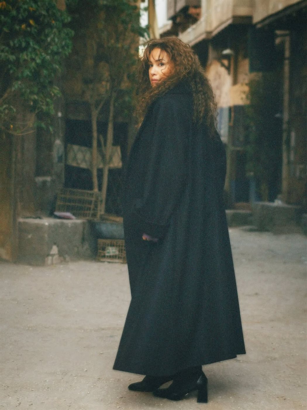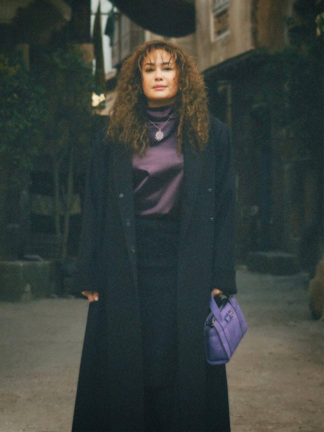 وظهرت هند صبري بإطلالة كلاسيكية شتوية من اللون اللافندر والأسود، عبارة عن بلوزة من الستان باللون اللافند مع حقيبة يد مميزة، كما ارتدت بالطو وبنطال من اللون الأسود، والتي نسقتها بشكل رائع ومميز إلى جانب اعتماد الكيرلي في تسريحتها.
