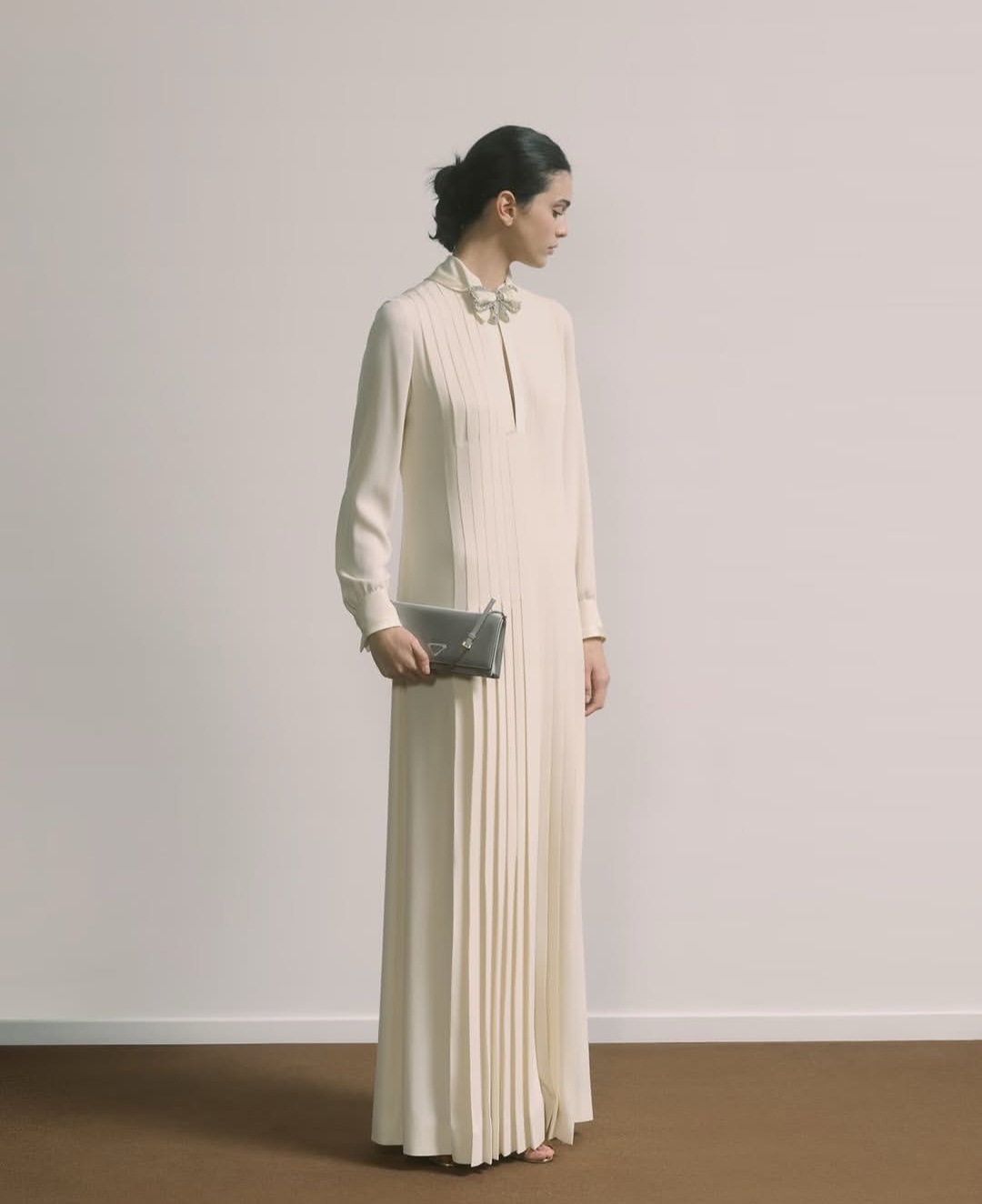 وفي تصاميم المساء، ارتقت برادا بالمجموعة إلى مستوى أكثر احتفالية، من خلال فساتين فاخرة من المخمل الناعم والساتان الحريري، إلى جانب أقمشة الدوشيس الراقية التي أضفت إحساسًا بالفخامة الهادئة. وزُيّنت بعض القطع بتطريزات كريستالية دقيقة جاءت بأسلوب ناعم ، لتناسب أجواء الشهر الفضيل وتعكس ذوقًا أنيقًا بعيدًا عن التكلف.