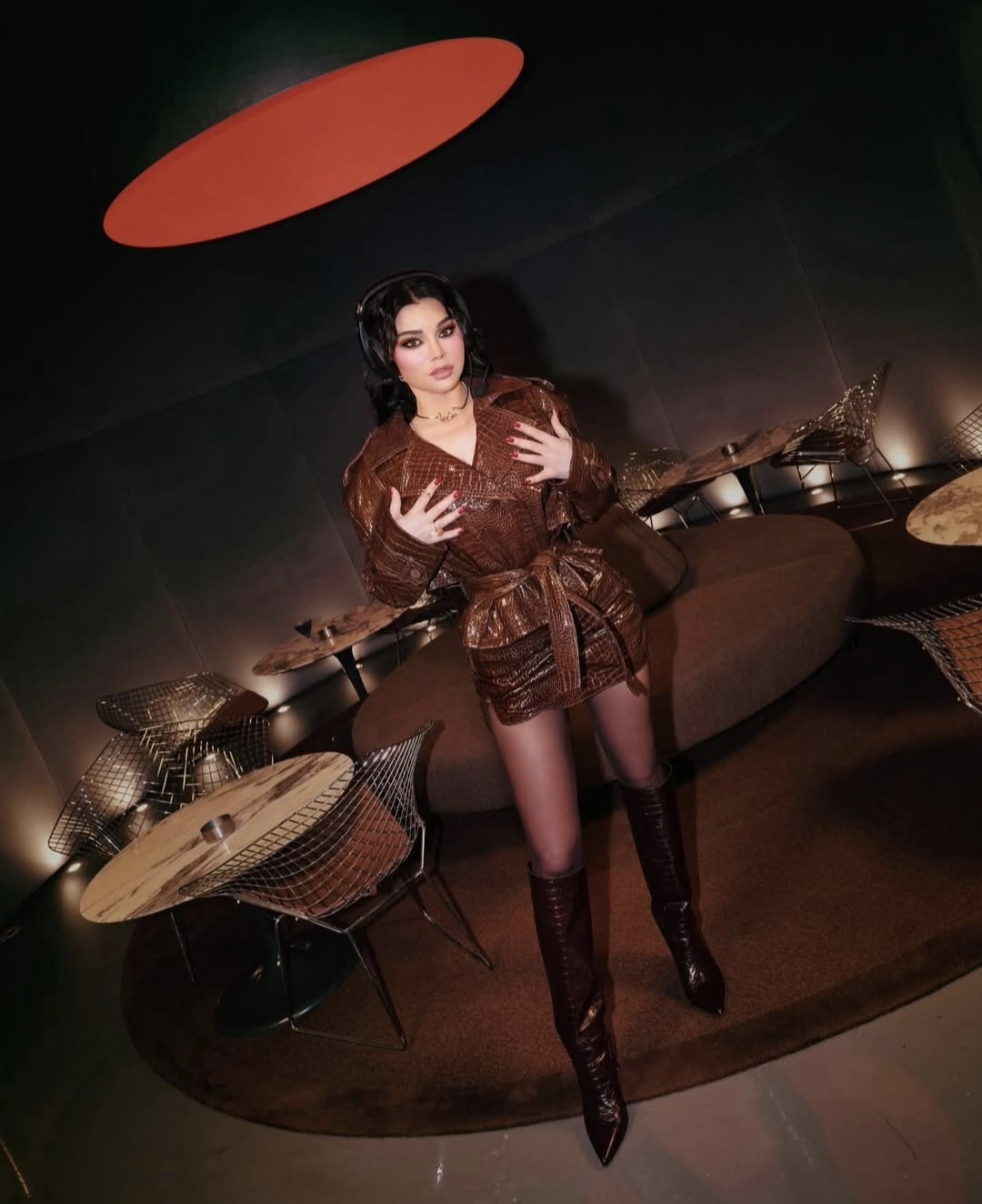 واعتمدت على إطلالة متكاملة من الجلد بنقشة التمساح، باللون البني الدافئ، وهو لون يُعد من أبرز درجات الموسم، لما يمنحه من إحساس بالفخامة