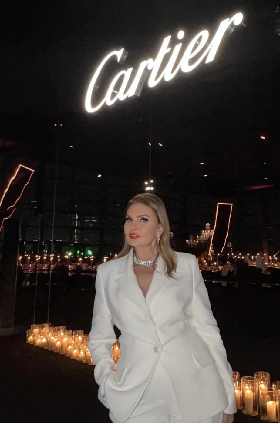 المجوهرات كانت محور الإطلالة، حيث ارتدت عقداً فاخراً مرصعاً بالألماس من Cartier التفّ حول عنقها ببريق لافت دون مبالغة، ليضيف لمسة فخامة متكاملة مع بساطة البدلة. واختارت أن تترك المجوهرات تتصدر المشهد من خلال تنسيق هادئ ومتوازن، بعيداً عن التكدس، ما عكس خبرتها الطويلة في فهم قواعد الأناقة الراقية.
