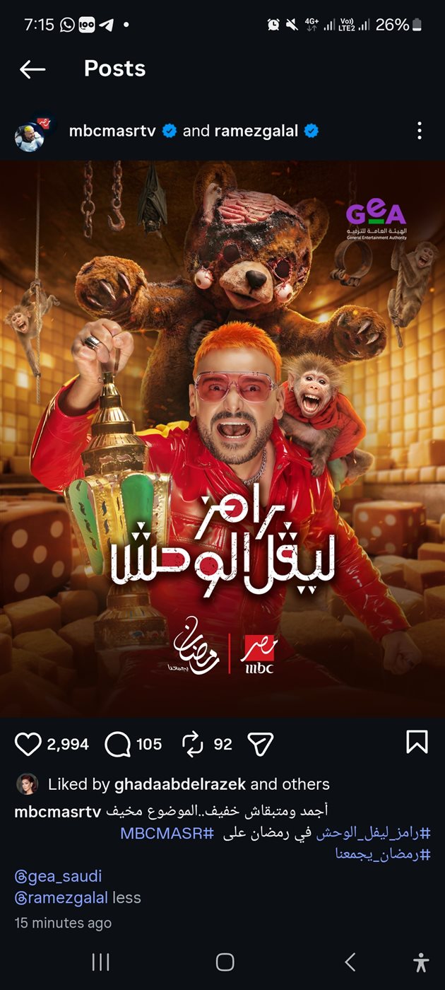 كشف الفنان رامز جلال عن بوستر تشويقي جديد لبرنامجه الجدي رامز ليفل الوحش، والذي من المقرر عرضه في رمضان 2026.