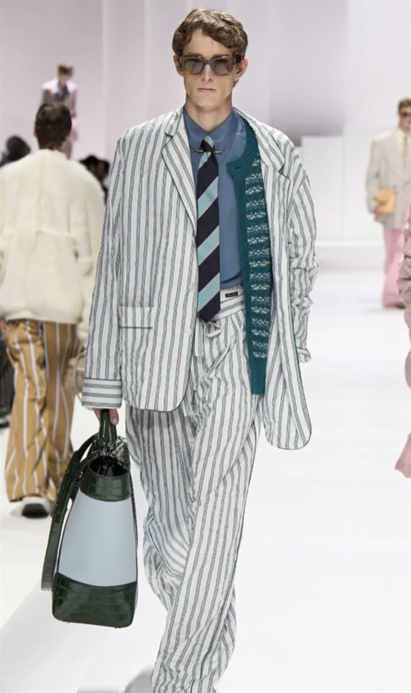 ومن بين النقوش التي تألقت بقوة، برزت البيزلي، خصوصًا في عروض الأزياء الرجالية، حيث أضفت لمسة فنية غنية بالتفاصيل على القمصان والسترات وحتى البدلات الرسمية، مؤكدة أن الجرأة لم تعد حكرًا على الأزياء النسائية.