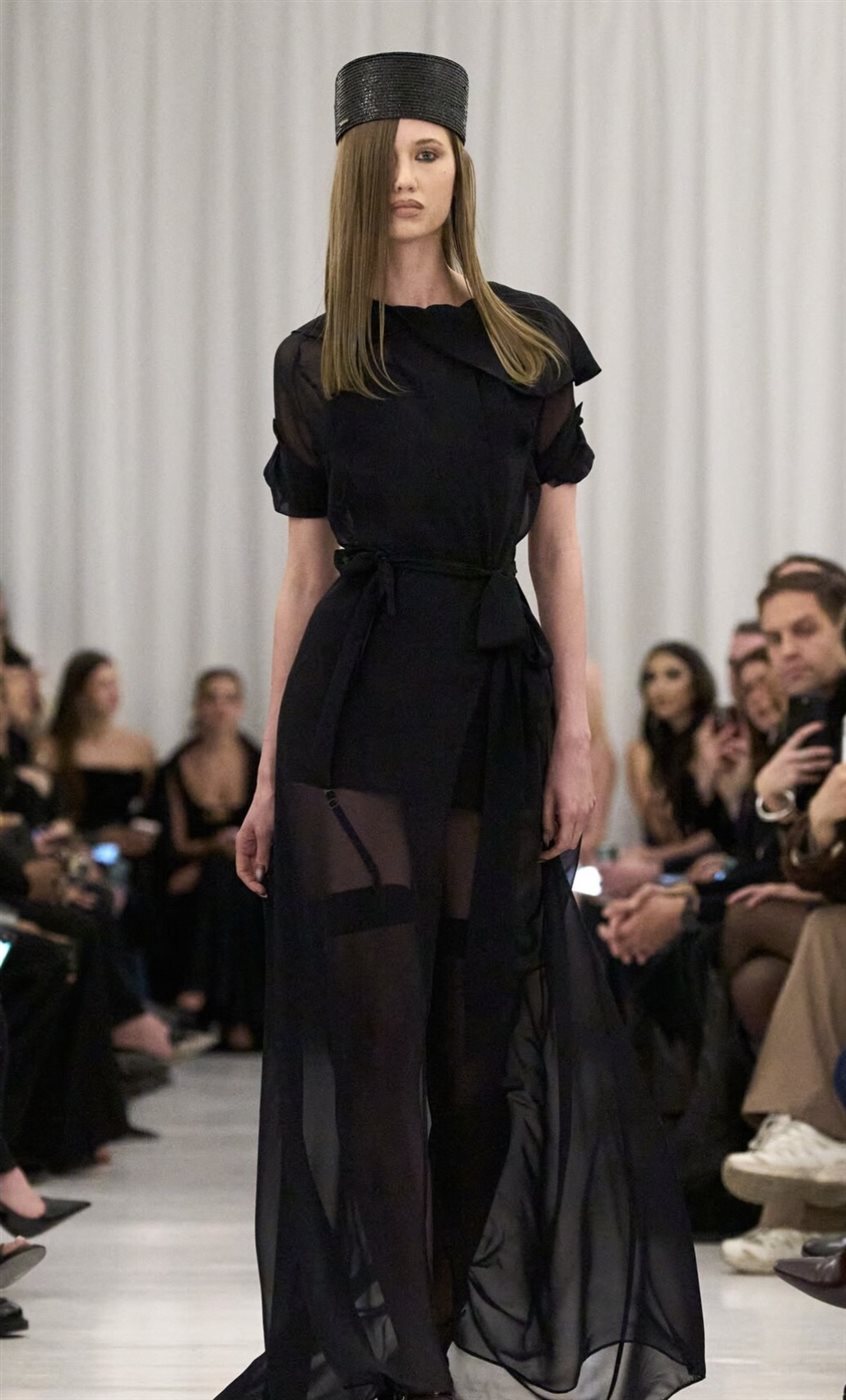 ومن أبرز عناصر المجموعة أيضًا اللقاء اللافت بين الدانتيل العتيق وبريق الكريستال. هذا التزاوج بين خامة تحمل عبق الماضي ولمعان يعكس حداثة اللحظة خلق توازنًا بصريًا آسِرًا. تحوّلت التفاصيل الرقيقة إلى مشهدية متكاملة تبهر العين تحت الأضواء، حيث انعكست البلورات على القماش وكأنها توثق لحظة الانكشاف قبل فتح الباب.