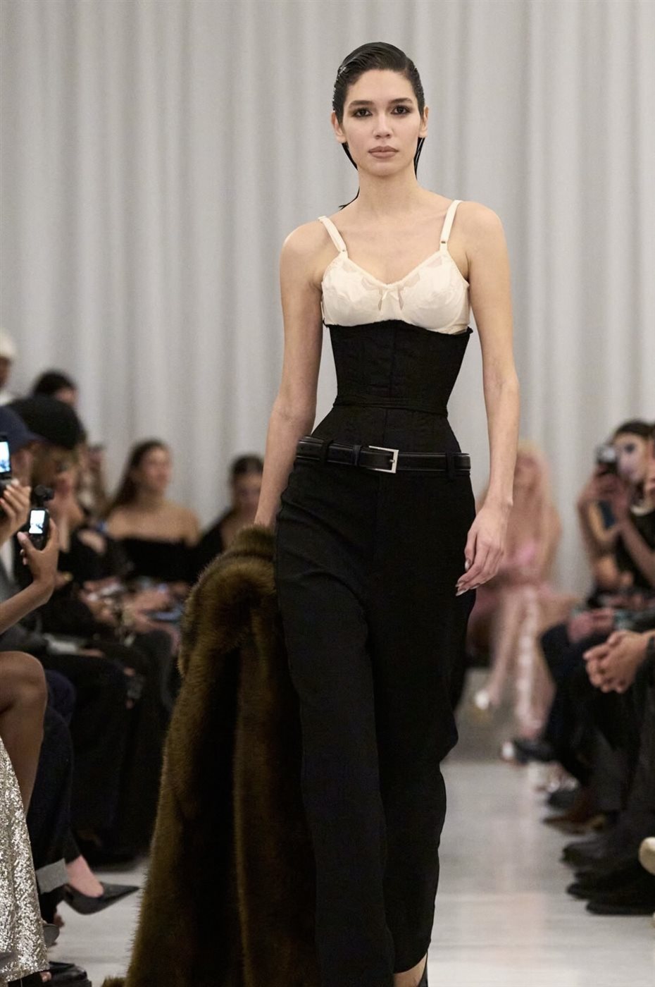 احتل الكورسيه مركز الصدارة في العرض، بوصفه رمزًا تاريخيًا معقدًا يجمع بين التقييد والتحرر. أعاد كوان صياغته برؤية معاصرة، فظهر بهياكل واضحة وخطوط دقيقة تعانق الجسد وتبرز ملامحه، لكن من دون أن تفقده حريته. بدت التصاميم وكأنها تحتفي بالقوة الكامنة في الهشاشة، مؤكدة أن الأنوثة ليست تناقضًا بين الصلابة والنعومة، بل مزيجًا متناغمًا بينهما.