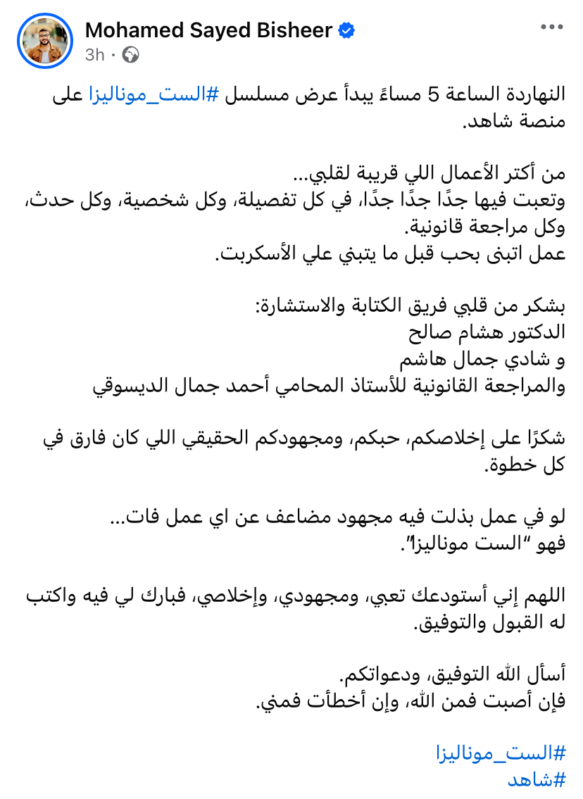 وكتب بشير عبر حسابه الرسمي على “فيسبوك”: “النهارده الساعة 5 مساء يبدأ عرض مسلسل الست موناليزا على منصة شاهد من أكتر الأعمال القريبة لقلبي وتعبت فيها جدا جدا في كل تفصيلة وكل شخصية وكل حدث وكل مراجعة قانونية عمل اتبنى بحب قبل ما يتبني على الاسكريبت”.
