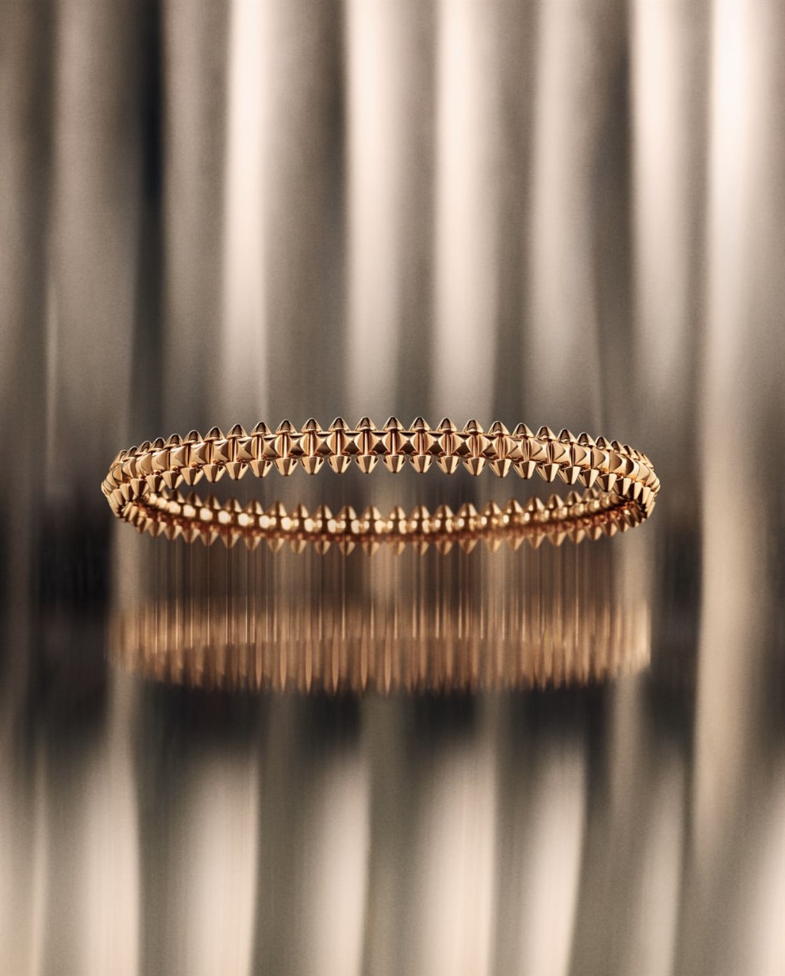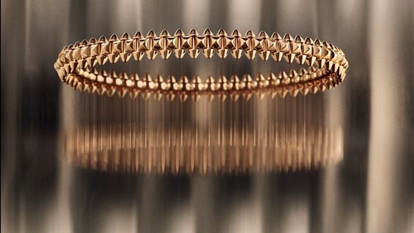 وتعتمد التصاميم الجديدة على فكرة هندسية واضحة، حيث تلتقي المسامير المعدنية مع عنصر Clous de Paris الشهير، وهو نمط زخرفي أيقوني ارتبط بتاريخ كارتييه في صياغة المجوهرات والساعات. هذا الدمج لا يأتي فقط كخيار جمالي، بل يعكس رؤية تصميمية تسعى إلى خلق حوار بين الصلابة والمرونة، وبين الجرأة والنعومة، وهو ما يمنح القطع طابعاً فريداً يمكن ارتداؤه بأساليب متعددة. فالهيكل المرن الذي تتبناه المجموعة يضفي إحساساً بالحركة والانسيابية، مما يجعل المجوهرات أكثر راحة وعصرية، مع الحفاظ على حضورها القوي واللافت.