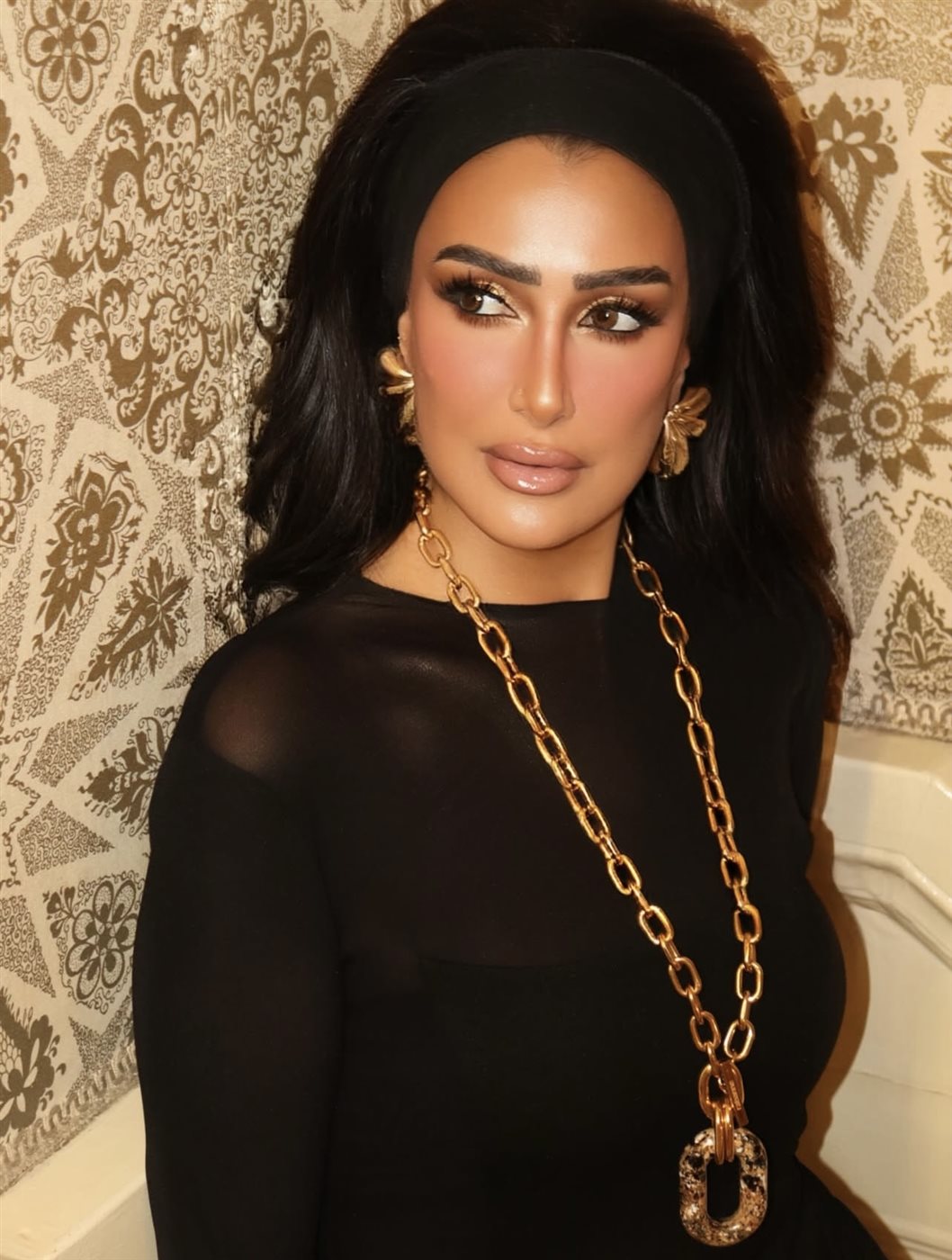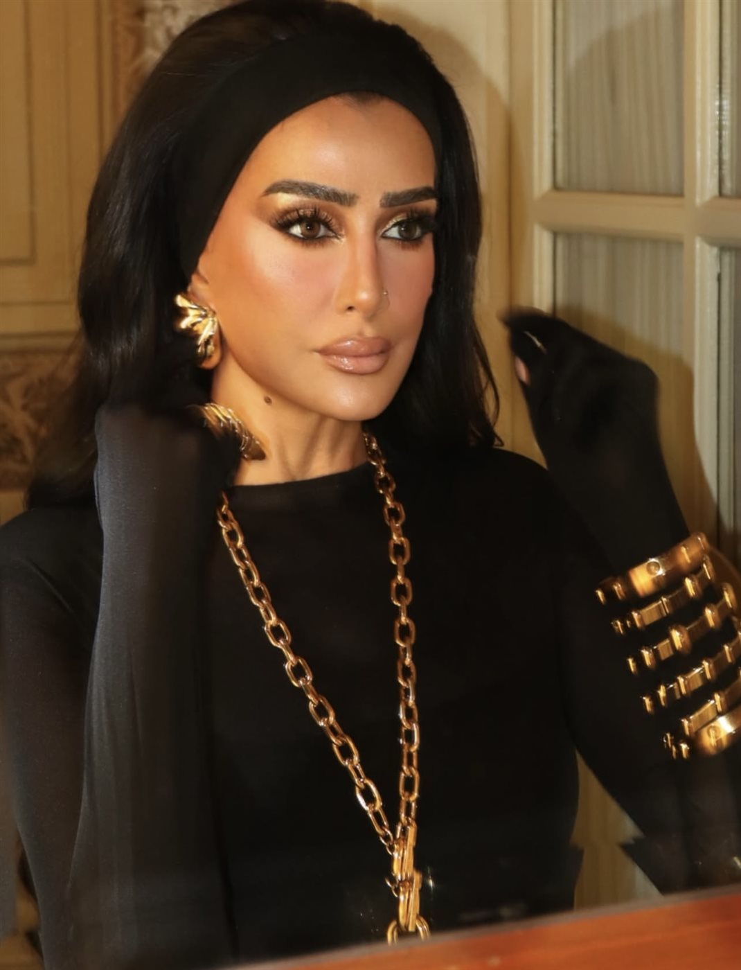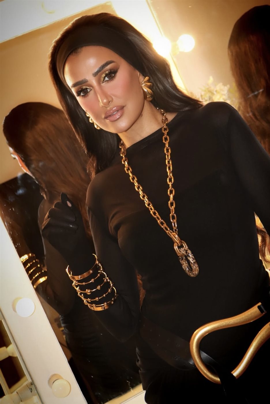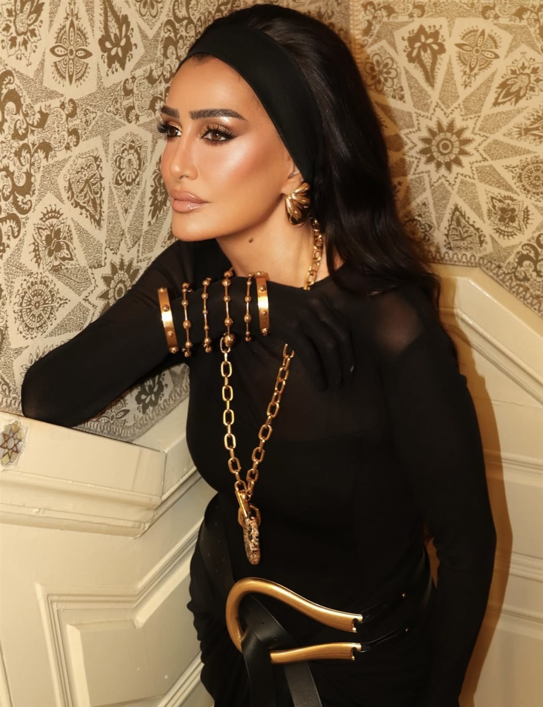 أما الإكسسوارات، فقد لعبت دورا محوريا في إبراز جمال الإطلالة، حيث اختارت سلسلة ذهبية طويلة بأحجام بارزة، إلى جانب أقراط كبيرة وأساور متعددة بتدرجات اللون الذهبي، ما خلق توازنا بصريا جميلا بين بساطة اللون الأسود وقوة التفاصيل المعدنية. هذا التناغم بين الألوان منح الإطلالة بعدا فاخرا وأكد اهتماما واضحا بأدق العناصر.