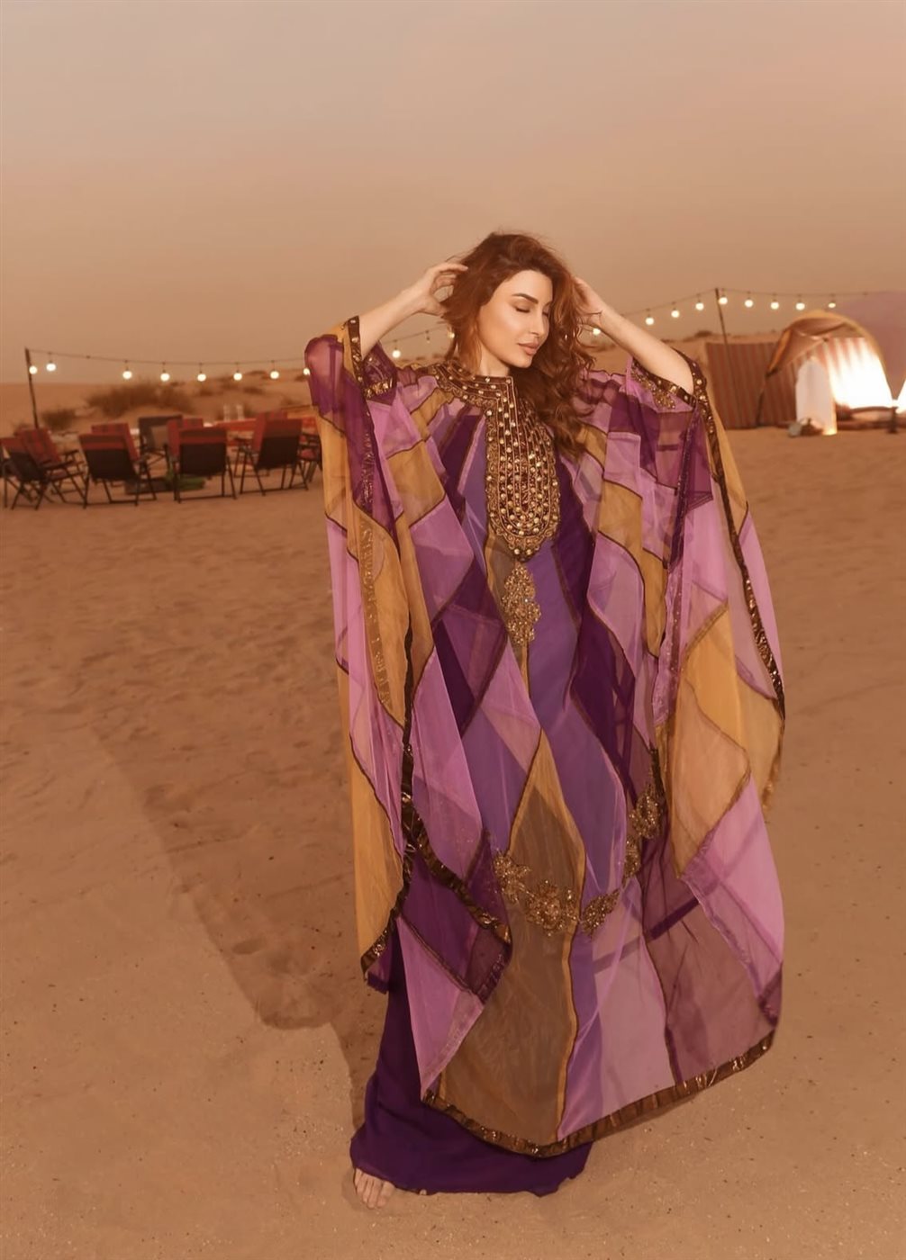 اختارت يارا قفطانا واسعا بتصميم انسيابي مميز، تميز بتدرجات لونية جمعت بين البنفسجي بدرجاته المختلفة والذهبي الدافئ، في تناغم لافت يحاكي ألوان الغروب فوق الرمال. وجاء القماش خفيفا متطايرا، ما أضفى حركة شاعرية على الإطلالة، خاصة في اللقطات التي فردت فيها يديها ليظهر التصميم كأنه جناحان ينسابان مع الهواء.
