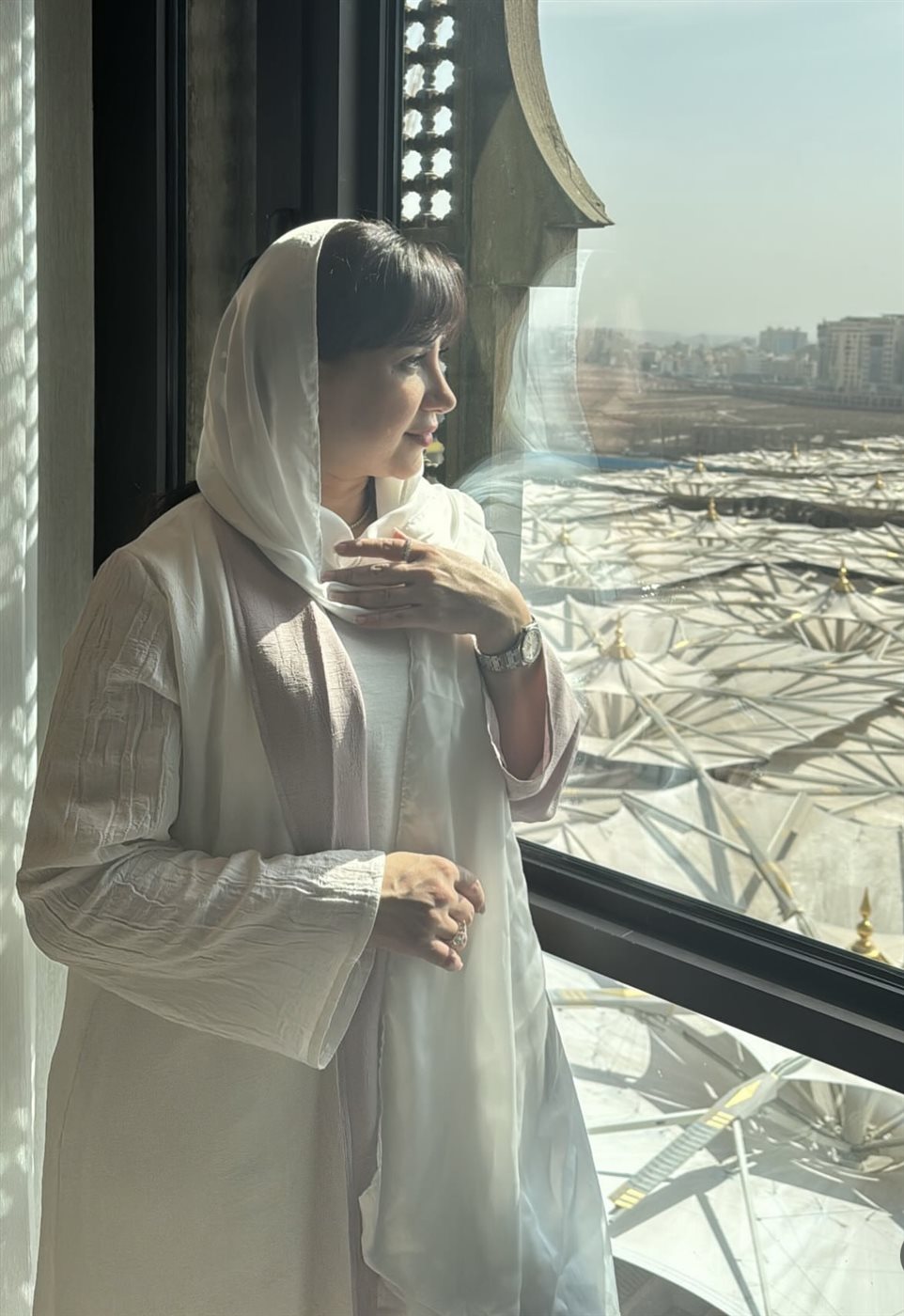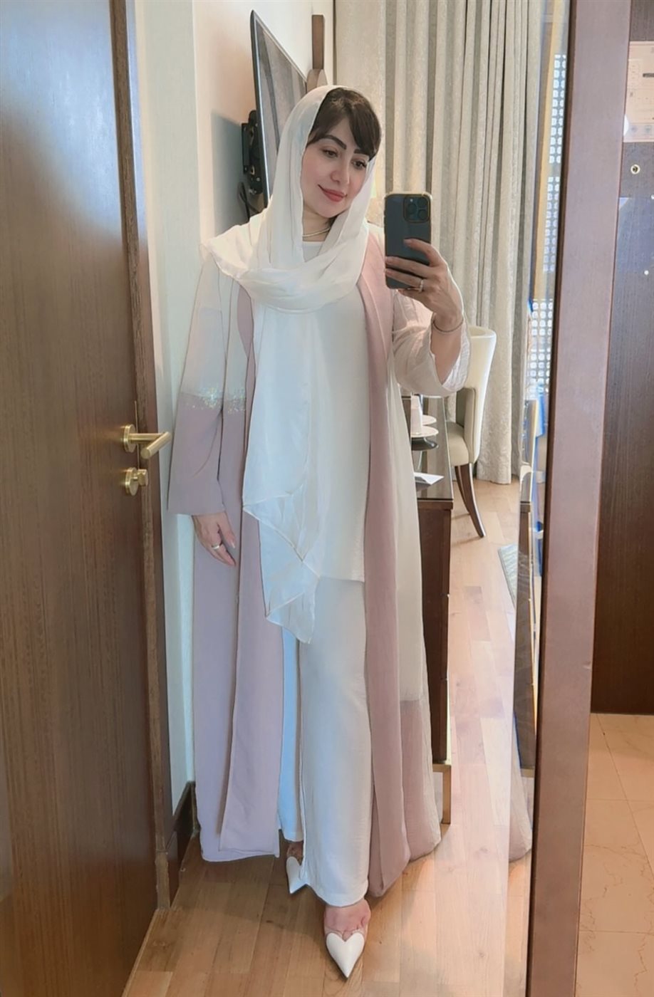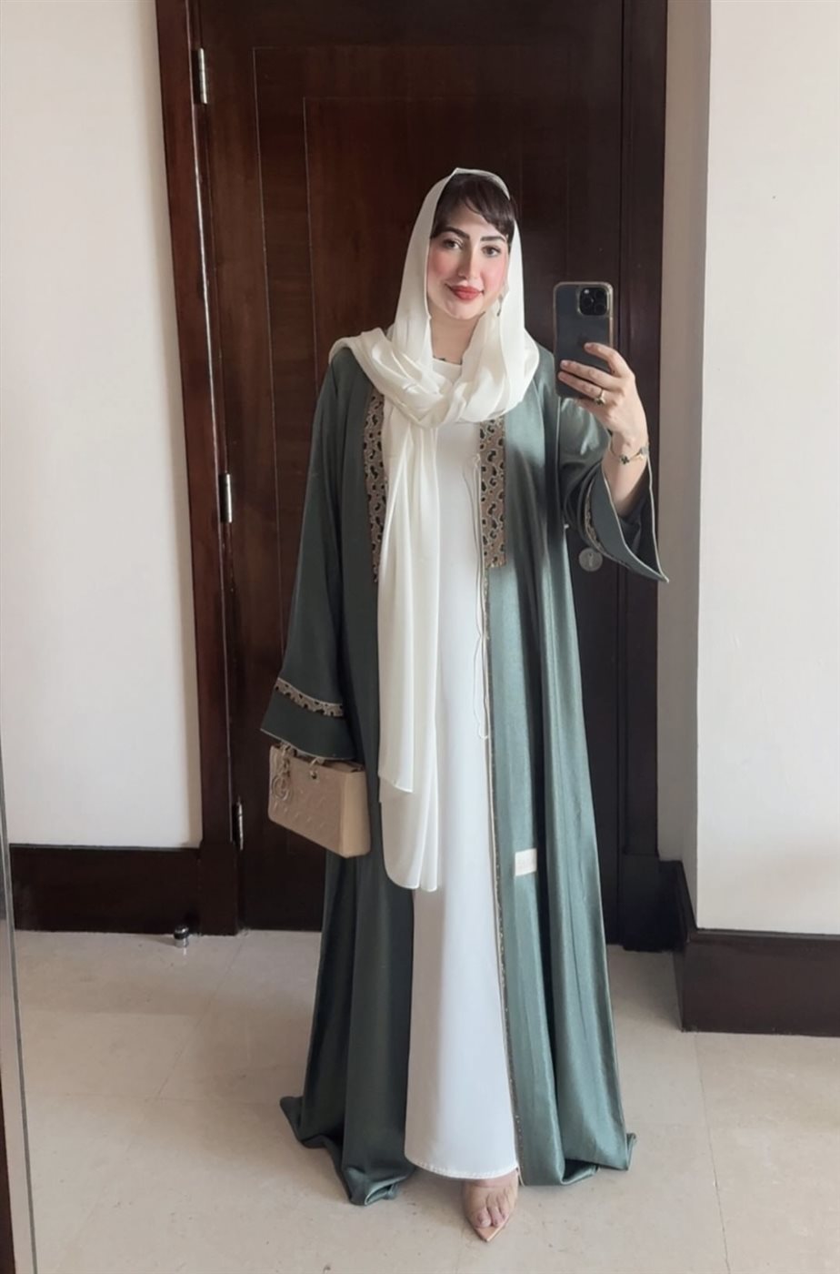 أما الإطلالة الثالثة فجاءت بعباية بدرجة الأخضر الهادئ مع تطريزات ناعمة عند الأطراف، لتضيف لمسة شرقية أنيقة تعكس الطابع التقليدي العصري في آن واحد. واختارت بوسي حقيبة صغيرة بلون محايد أكملت بها تنسيقها، في حين حافظت على الوشاح الأبيض الذي أصبح عنصرا أساسيا يربط بين الإطلالات الثلاث ويمنحها هوية متناسقة.
