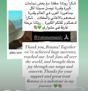ونشر رمضان عبر “ستوري” حسابه الرسمي على موقع الصور والفيديوهات الشهير “إنستجرام”، وكتب قائلا: “شكرا روتانا حققنا مع بعض نجاحات كبيرة وقدرنا نوصل صوتنا لكل جماهيرنا العرب في العالم وقدرنا نسعدهم بالأغاني والحفلات”، موجهًا الشكر لشركة روتانا على دعمه، قائلا: “شكرا لدعمكم وثقتكم الكبيرة.. روتانا مرحلة فارقة في مشواري”.