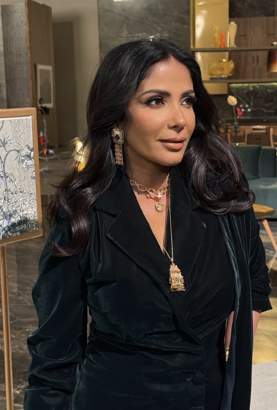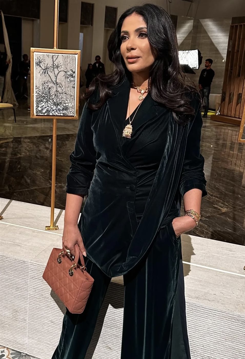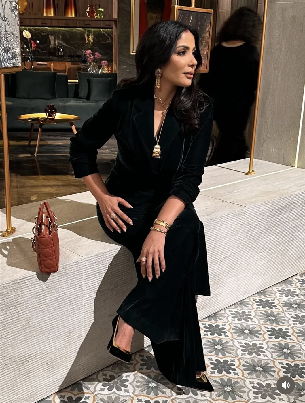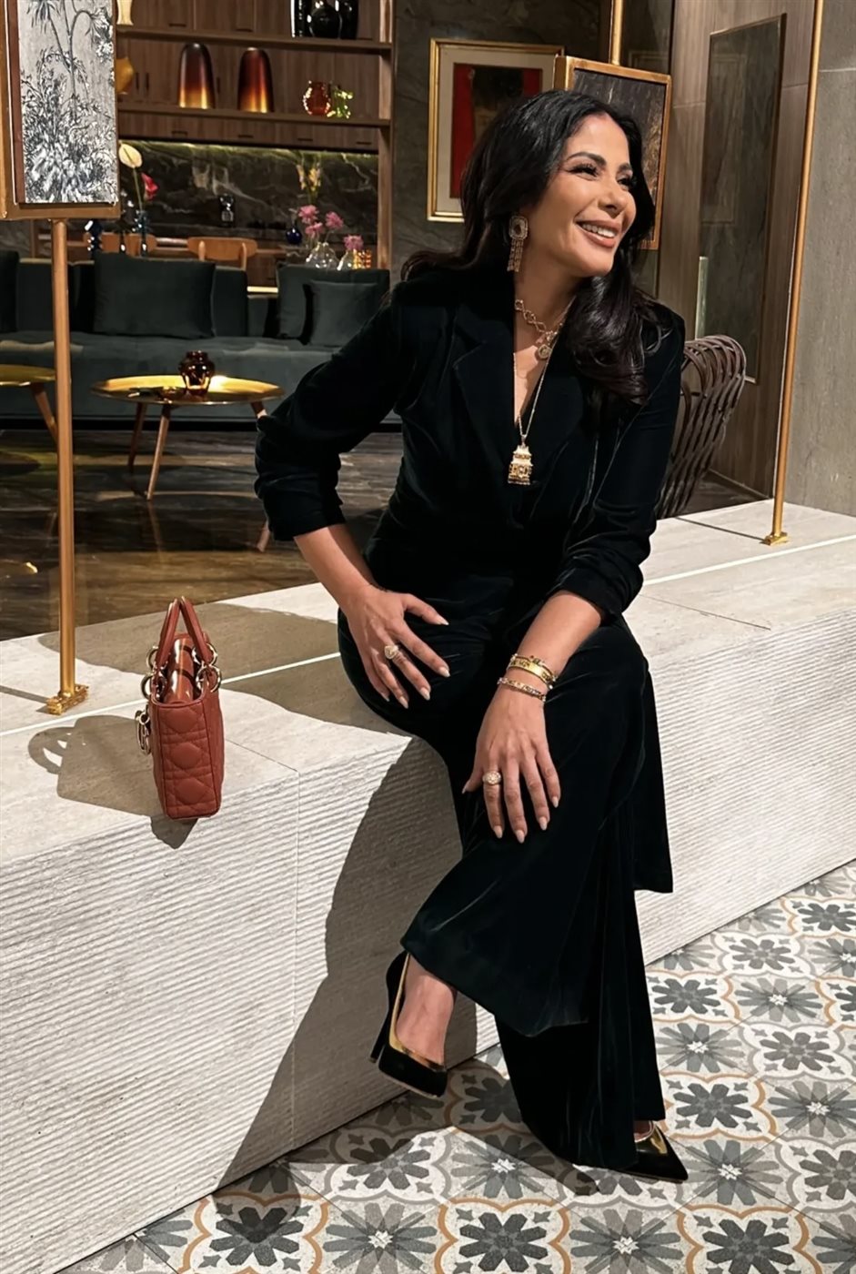 ولم تتوقف جاذبية اللوك عند الملابس فقط، بل لعبت الإكسسوارات دورًا مهمًا في استكمال الصورة العامة. فقد اختارت منى مجوهرات ذهبية بارزة نسبيًا، شملت عقدًا بطبقات متعددة وأقراطًا أنيقة وأساور ناعمة، ما أضاف دفئًا بصريًا وكسر حيادية اللون الأسود بطريقة متوازنة وجاءت الاكسسوارات بتوقيع soufyjewelry. كما حملت حقيبة يد صغيرة بتصميم كلاسيكي، ساهمت في تعزيز الطابع الفاخر للإطلالة من دون أن تسرق الأضواء من العنصر الأساسي.