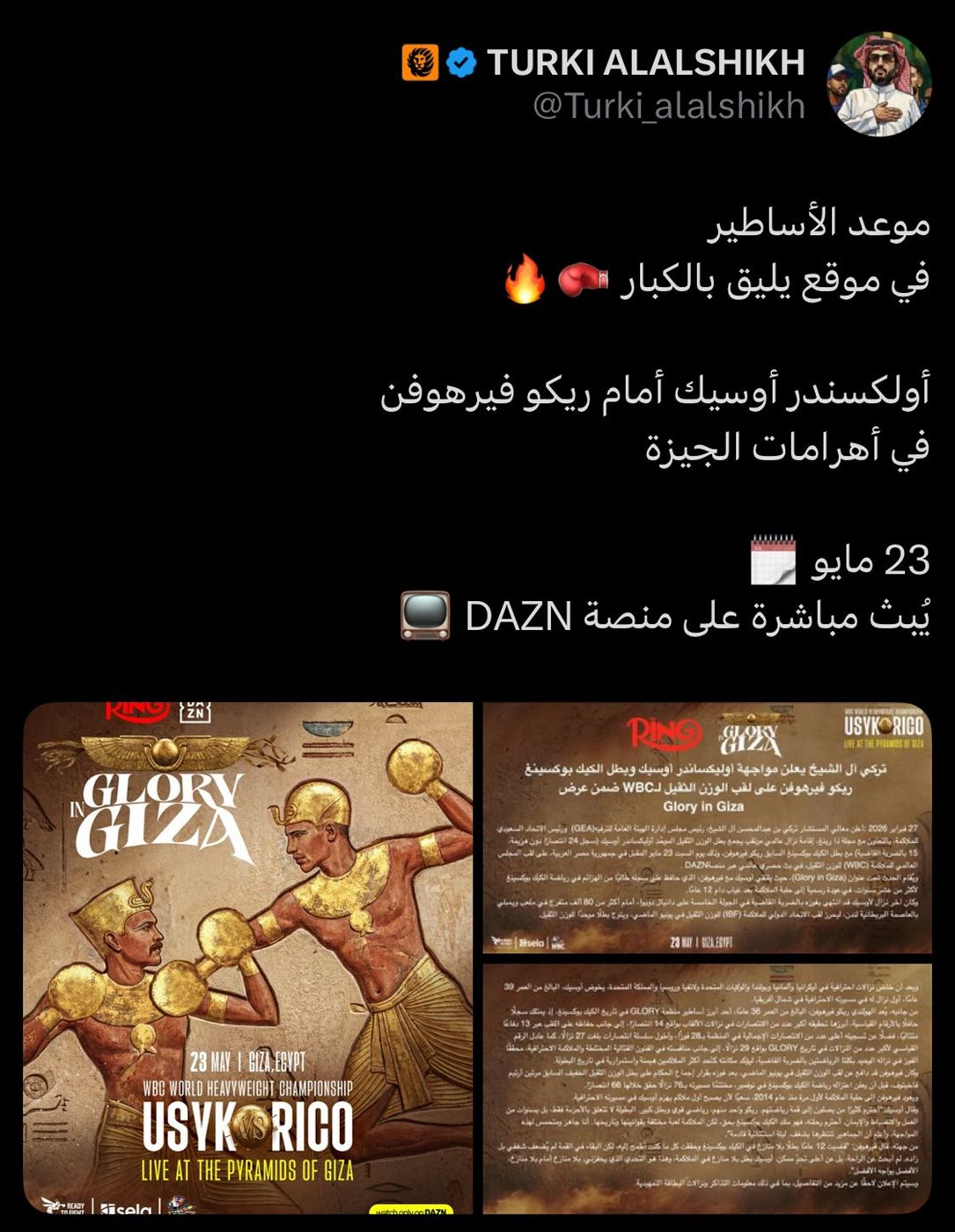 أعلن المستشار تركي آل الشيخ عن تنظيم نزال عالمي مرتقب يوم 23 مايو 2026 في مصر، في حدث رياضي استثنائي يُقام على سفح أهرامات الجيزة، ويجمع بين بطل العالم في الوزن الثقيل الموحّد أوليكساندر أوسيك وبطل الكيك بوكسينغ الهولندي ريكو فيرهوفن، وذلك على لقب المجلس العالمي للملاكمة WBC للوزن الثقيل، ضمن عرض يحمل عنوان “Glory in Giza”، على أن يتم بثه حصريًا عالميًا عبر منصة DAZN.