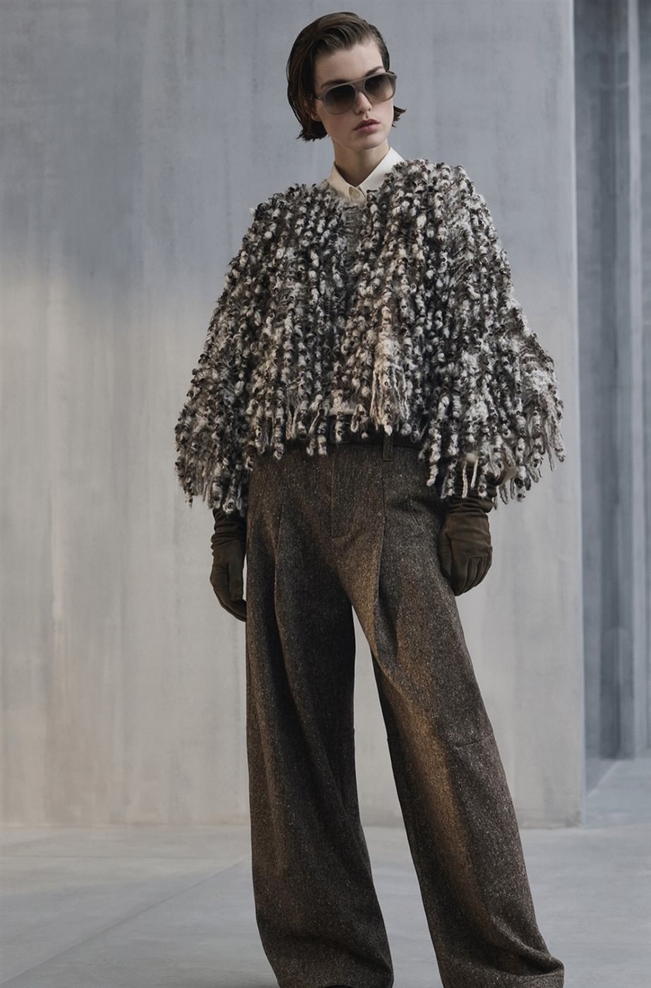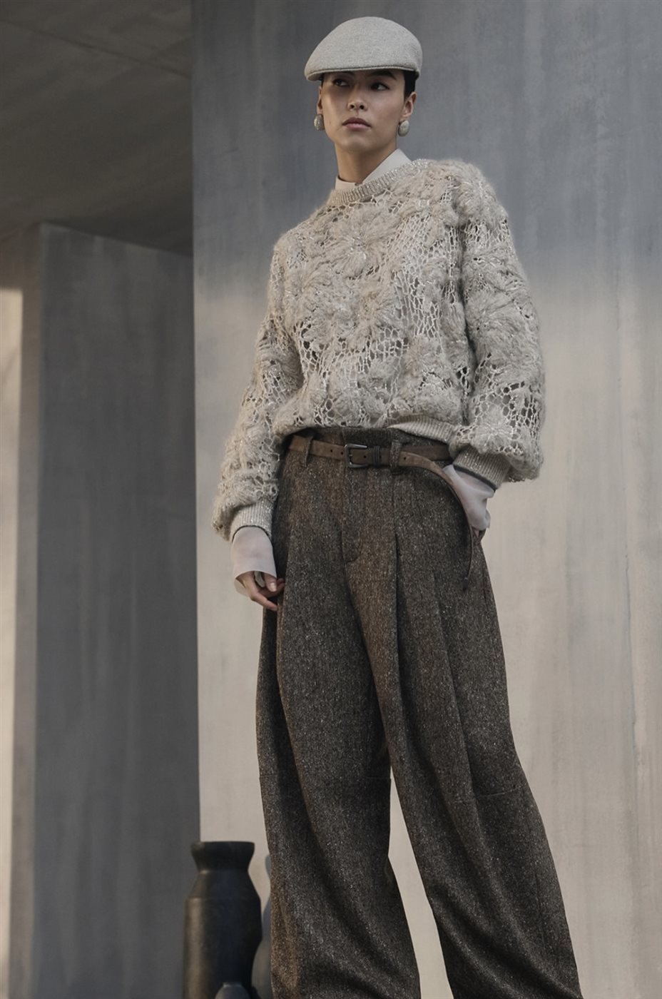 أما الخامات، فقد لعبت دوراً محورياً في بناء هوية المجموعة، إذ برز التويد بملمسه الغني ليمنح التصاميم عمقاً بصرياً وإحساساً بالدفء، في حين أضاف الحرير انسيابية ناعمة تعكس خفة الحركة والراحة. كما جاء الدانتيل ليعزز البعد الرومانسي، في توازن دقيق بين الفخامة والهدوء. هذا التنوع في الخامات يعكس فلسفة برونيلو كوتشينيلي القائمة على الجودة المطلقة، حيث تتحول الأقمشة إلى عنصر أساسي في سرد قصة كل إطلالة.