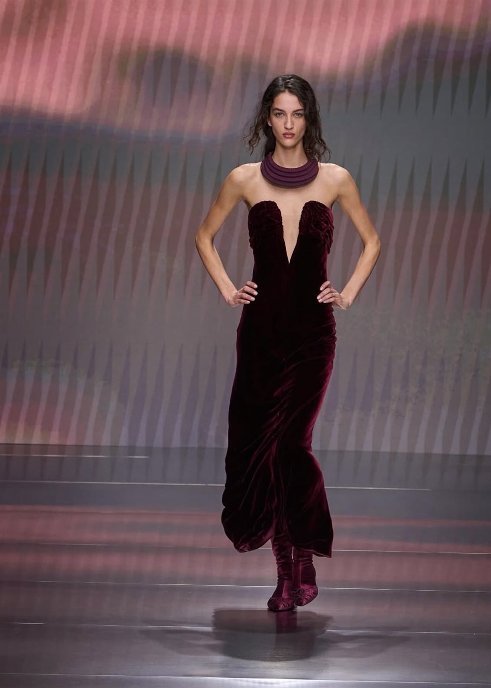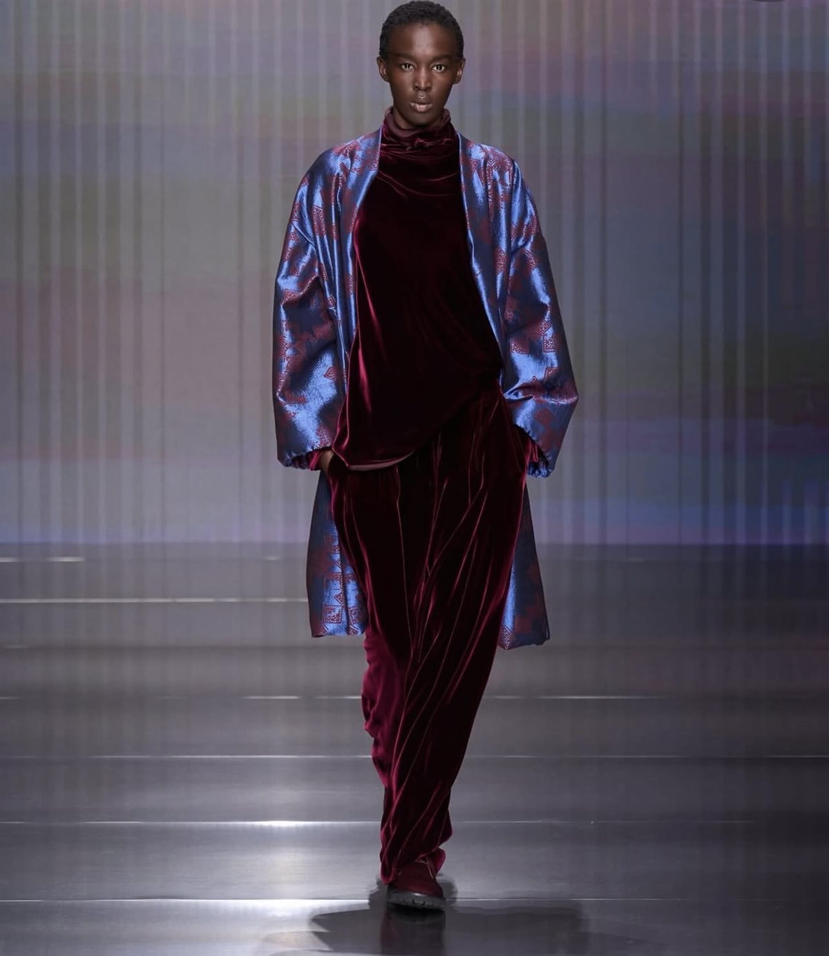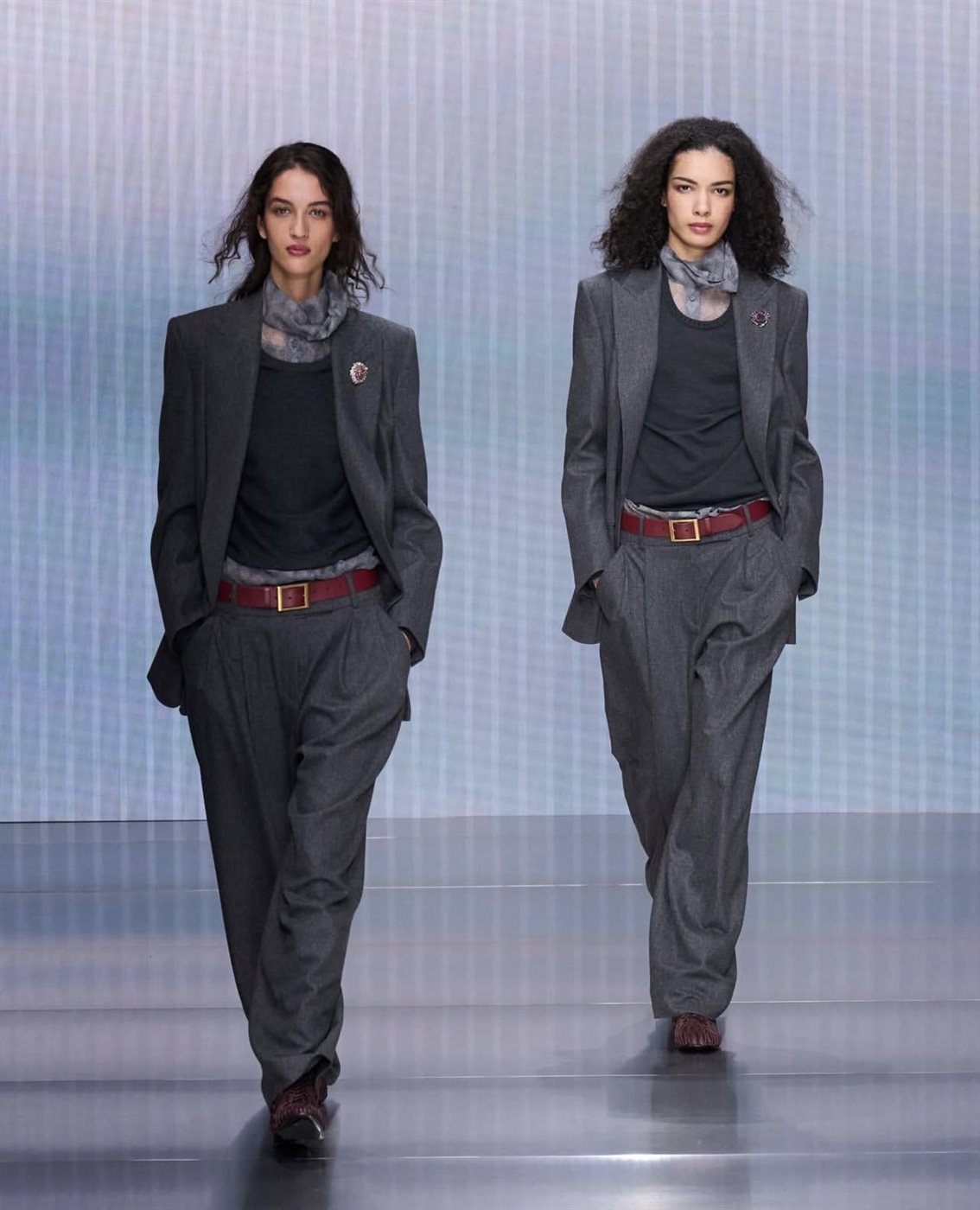 فمنذ اللحظة الأولى للعرض، برزت هوية Giorgio Armani الواضحة من خلال القصّات الانسيابية والخطوط النظيفة التي تمنح الإطلالات توازناً بين القوة والنعومة. اعتمدت المجموعة على تصاميم تعكس مفهوم الأناقة المعاصرة، فظهرت البذلات المفصّلة بدقة مع سترات ذات أكتاف ناعمة وبناطيل واسعة تعكس الراحة من دون التخلي عن الرقي. كما حضرت المعاطف الطويلة بخامات شتوية فاخرة، لتضيف بعداً عملياً يناسب الموسم مع الحفاظ على الطابع الكلاسيكي الذي يميز الدار.