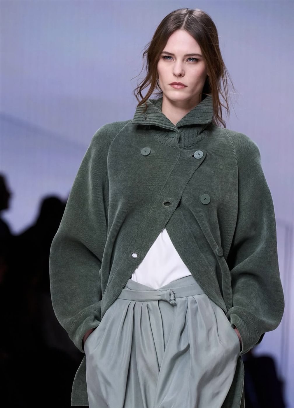 أما لوحة الألوان، فجاءت متناغمة مع أجواء الخريف والشتاء، حيث سيطرت الدرجات الداكنة مثل الأسود والرمادي والأزرق العميق، مع لمسات لونية أكثر دفئاً أضفت حيوية على بعض الإطلالات. هذا الاختيار اللوني لم يكن عشوائياً، بل جاء ليعكس رؤية أرماني القائمة على الفخامة الهادئة التي تعتمد على التوازن بدلاً من المبالغة. كما لعبت الخامات دوراً أساسياً في إبراز روح المجموعة، إذ بدت الأقمشة ناعمة وغنية بالملمس، ما منح القطع طابعاً حسياً أنيقاً يعزز من حضورها على منصة العرض.