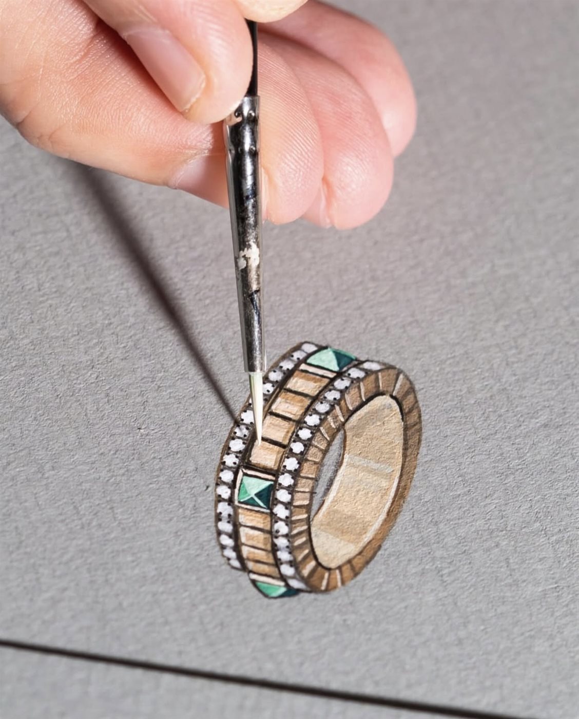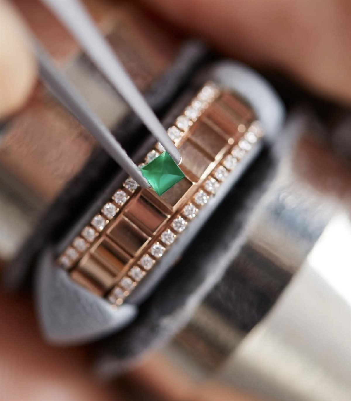 وقد حرصت الدار على اختيار هذا الحجر بعناية فائقة، حيث يتميز بجماله الفريد ولونه الأخضر العميق الذي يضفي على القطع لمسة من الحيوية والأناقة. كما أن عملية القطع الدقيقة التي يخضع لها الحجر تمنحه بريقاً خاصاً يعكس الضوء بطريقة لافتة، ما يعزز حضور القطعة ويجعلها تعبيراً فنياً عن الطاقة التي تنبض بها المدينة.