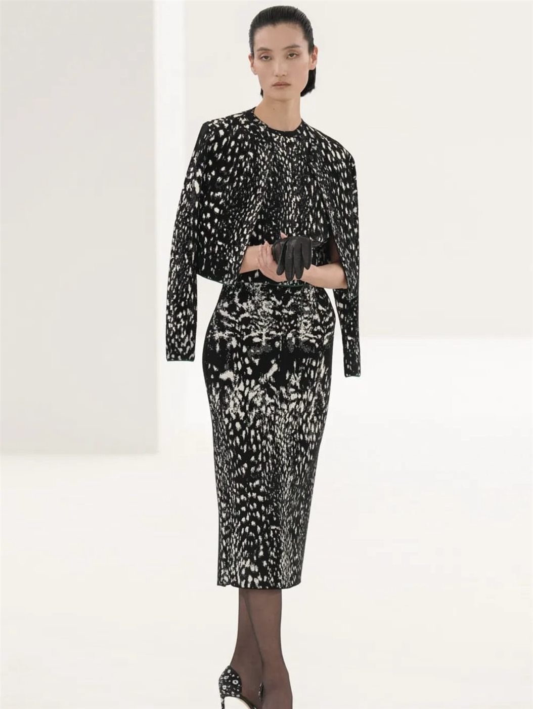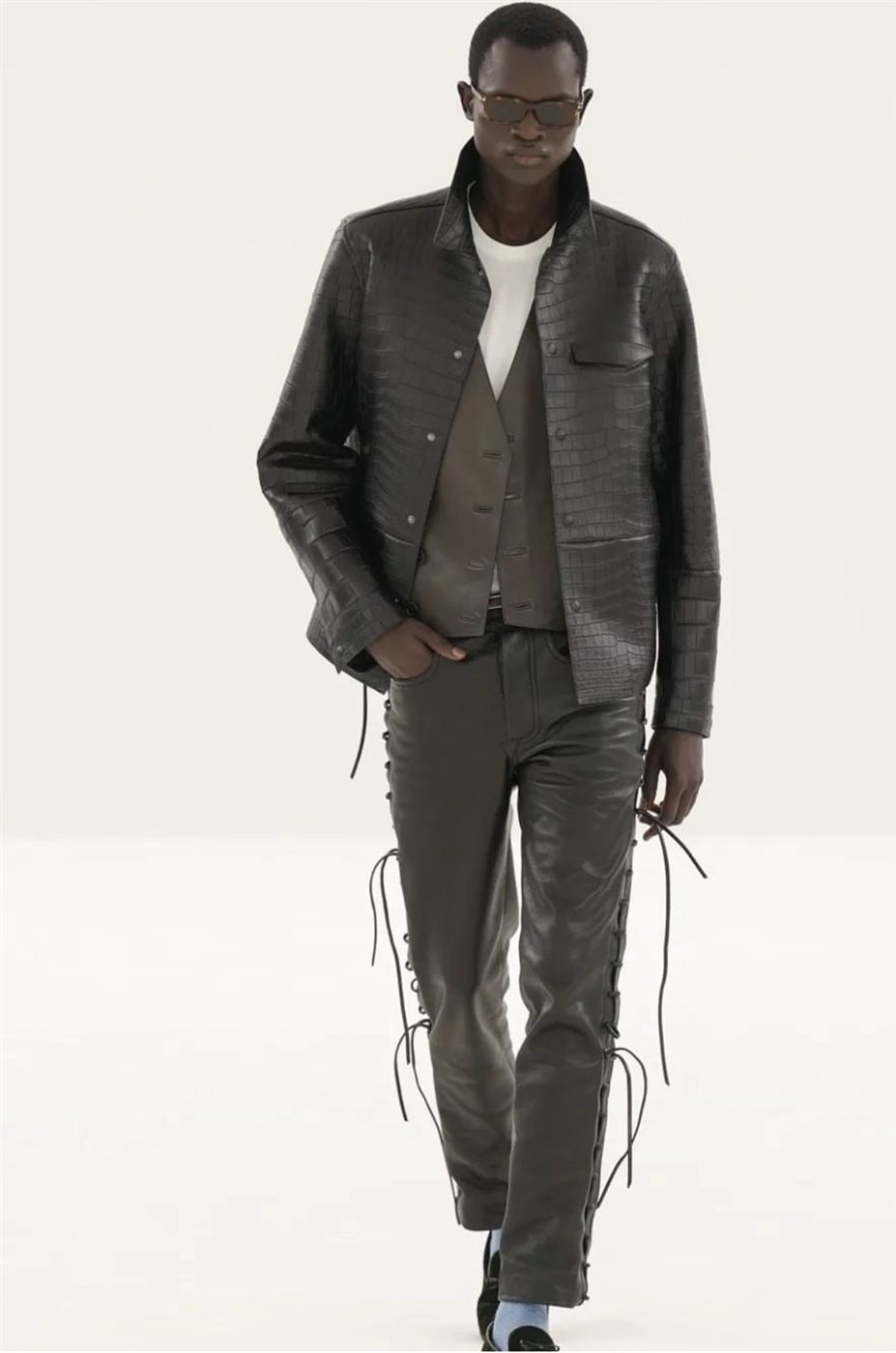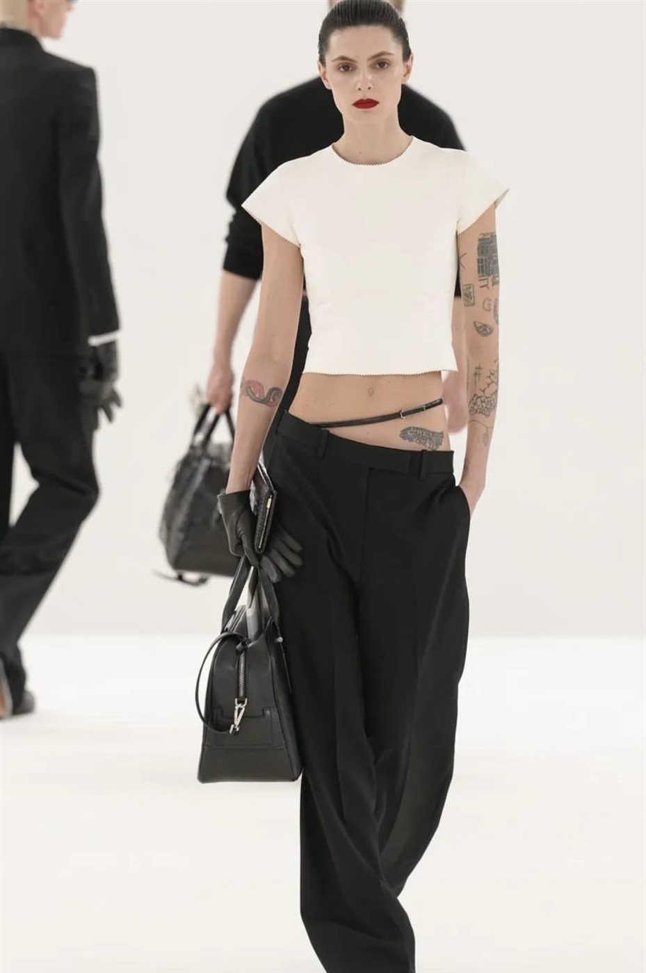 وعلى منصة العرض، ظهرت الإطلالات بطابع درامي أنيق يعكس أسلوب الدار المميز، حيث سيطرت القطع الجلدية السوداء، والبدلات المفصلة بعناية، إلى جانب الفساتين الحريرية ذات الشقوق العالية والتفاصيل اللامعة التي تعكس روح السهرة الفاخرة. كما حضرت القصّات الجريئة والأقمشة الشفافة في بعض الإطلالات، ما عزز عنصر الجاذبية الذي لطالما ارتبط بعروض Tom Ford.