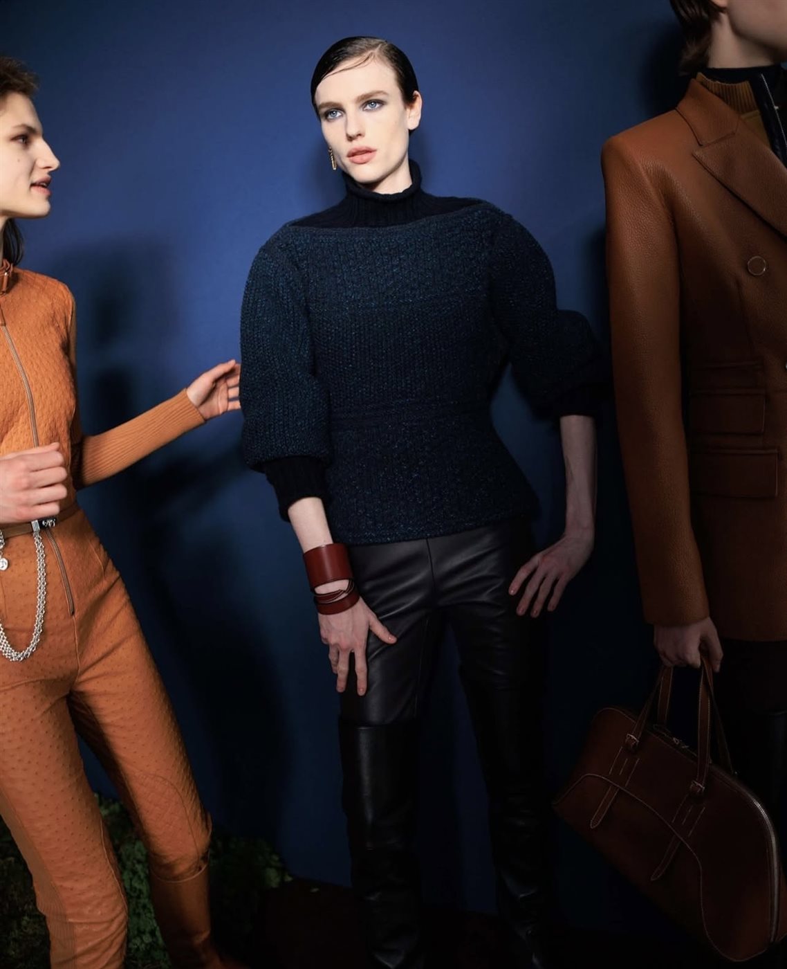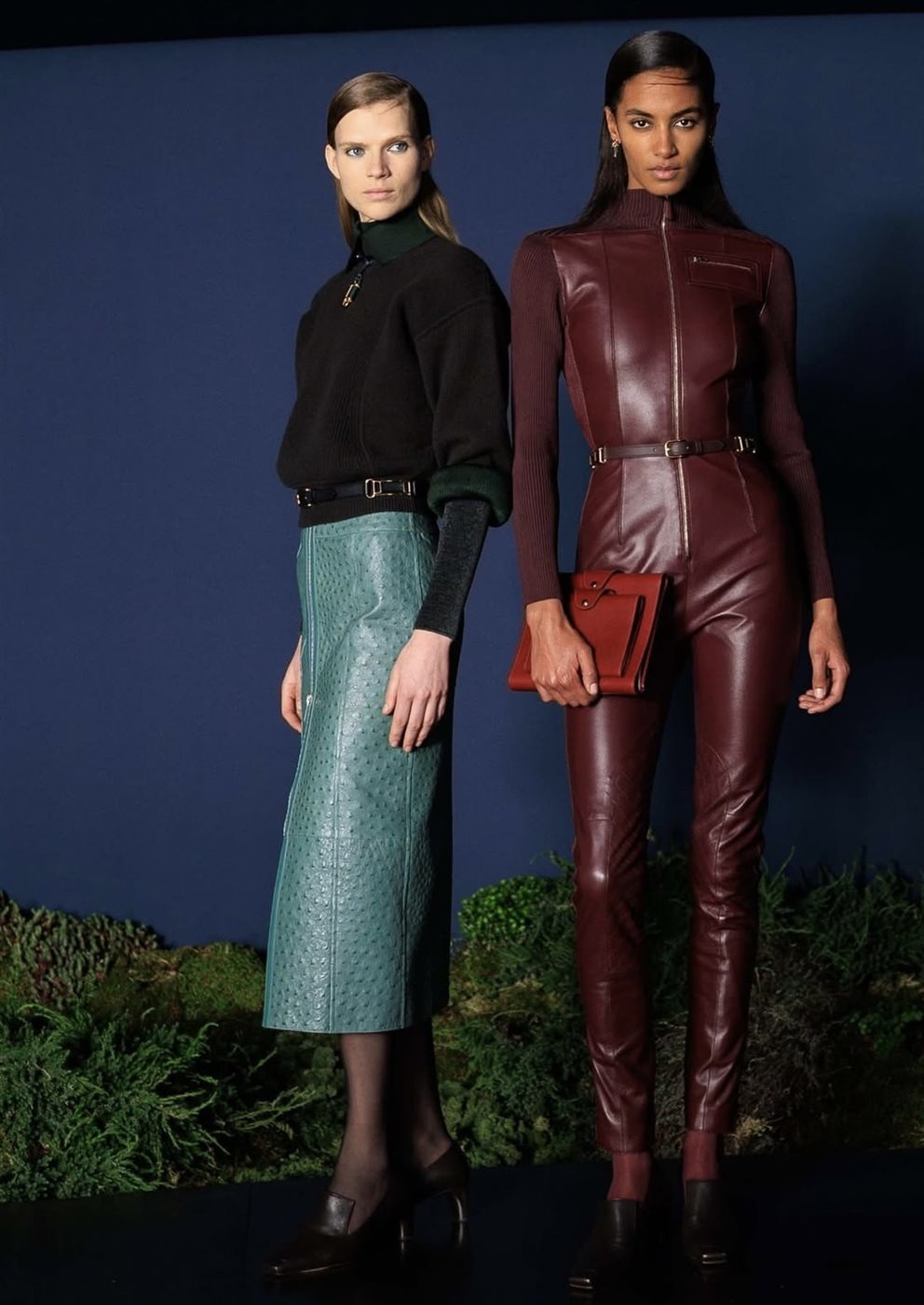 أما لوحة الألوان فجاءت مستوحاة من أجواء الخريف الدافئة، حيث برزت درجات البرغندي العميق، والكاميل الكلاسيكي، والرمادي الهادئ، وهي ألوان تعكس الفخامة الهادئة التي ترتبط عادة بعالم Hermès. كما لعب الجلد دوراً أساسياً في تشكيل هوية المجموعة، إذ ظهرت القطع الجلدية بتصاميم راقية تعكس مهارة الدار الطويلة في التعامل مع هذه الخامة التي تعد جزءاً أساسياً من إرثها.