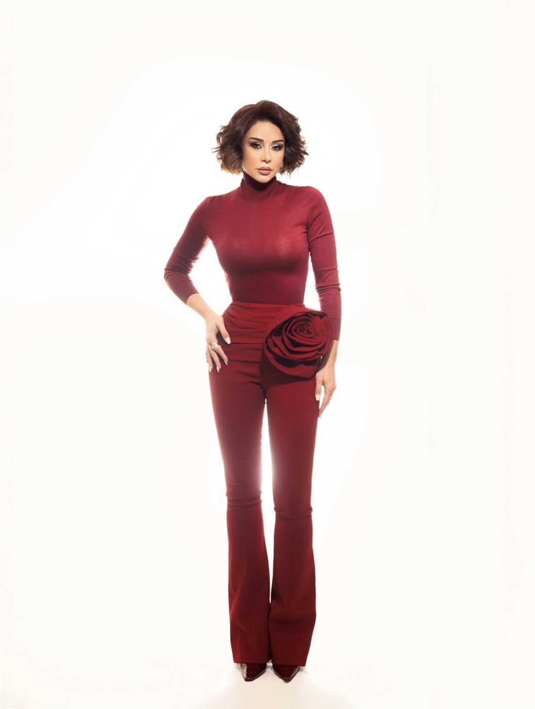 اعتمدت كاريس بشار في هذه الإطلالة على تصميم باللون الأحمر القاني، وهو لون يعكس الثقة والقوة ويبرز حضورها الجذاب. وجاء التصميم بقصة ضيقة عند الجزء العلوي مع ياقة مرتفعة وأكمام طويلة، ما منح الإطلالة طابعاً كلاسيكياً أنيقاً. أما الجزء السفلي فتميّز ببنطال واسع قليلاً عند الأسفل مع خصر مرتفع، ما أضفى على اللوك لمسة عصرية متوازنة تجمع بين الأناقة والبساطة.