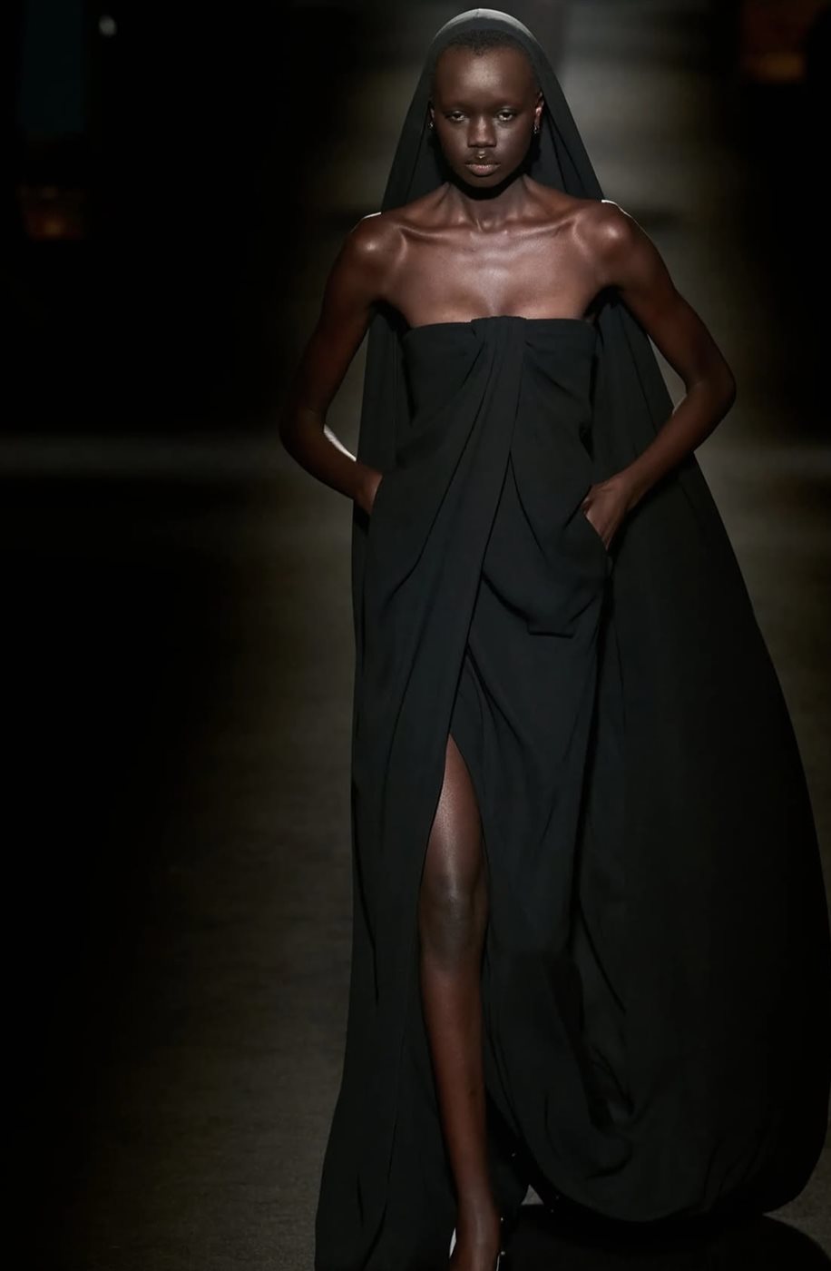 وقد شهد العرض حضورًا لافتًا من عشاق الموضة والنقاد والمتابعين لصناعة الأزياء، حيث تحوّلت منصة العرض إلى مساحة فنية تستعرض من خلالها الدار رؤيتها للموسم الجديد. وقد تميزت المجموعة بتصاميم تجمع بين الطابع المعماري واللمسات المستقبلية، مع قصّات حادة وبنى واضحة تعكس الاهتمام الكبير بالتفاصيل والخياطة المتقنة. كما برزت الأحجام الكبيرة في بعض القطع، وهو أسلوب لطالما ارتبط بهوية الدار، إذ يمنح التصاميم حضورًا قويًا ويضفي عليها طابعًا دراميًا لافتًا.