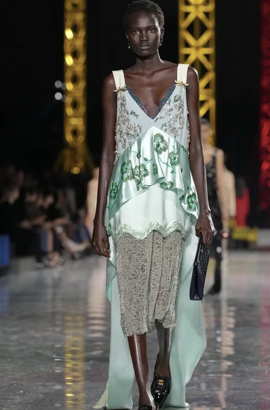 وعلى منصة العرض، تألقت مجموعة من العارضات اللواتي تربطهن علاقة قوية بالدار، وكان من بين أبرزهن العارضة العالمية أنوك ياي التي عادت لتخطف الأنظار بإطلالاتها المميزة. كما شاركت في العرض عارضات أخريات مثل ستيفاني كافالي وبهافيثا مانداڤا وأليكس كونساني، في لوحة بصرية عكست تنوع الجمال والهوية في عالم الموضة المعاصر.