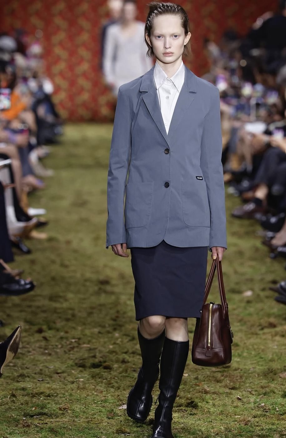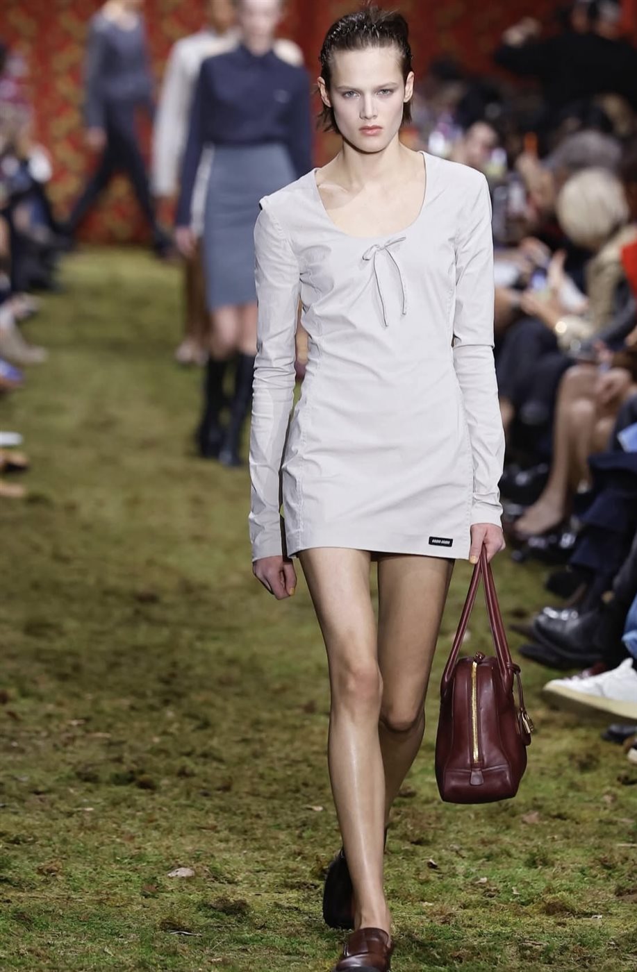 أما من حيث الأزياء، فقد استلهمت المجموعة الكثير من عناصرها من أرشيف Miu Miu، حيث ظهرت تصاميم أساسية بلمسات عفوية تعكس ما يعرف بجمالية “messy girl” أو الأسلوب غير المرتب المتعمد، وهو اتجاه جمالي يعكس شخصية المرأة الحرة التي لا تسعى إلى الكمال بقدر ما تحتفي بعفويتها. وقد تنوعت القطع بين فساتين بسيطة بقصّات مستقيمة، ومعاطف أنيقة بتفاصيل دقيقة، إلى جانب تنسيقات بدت وكأنها عفوية لكنها مدروسة بعناية لتعكس فلسفة الدار في إعادة تعريف الأناقة.