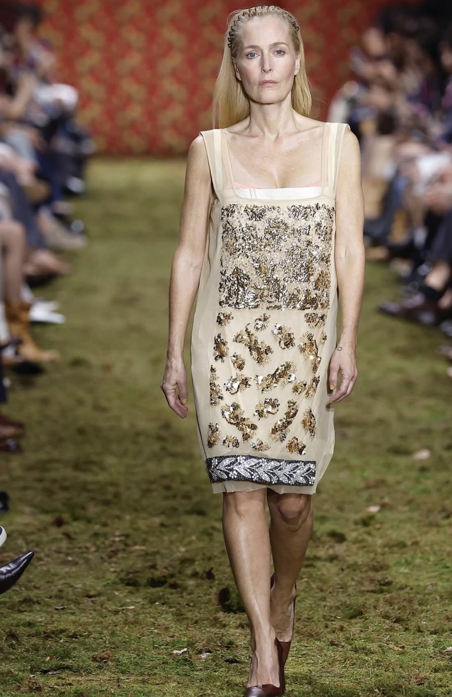 وشهد العرض حضور عدد من الوجوه البارزة على منصة العرض، من بينهم الممثلة وعارضة الأزياء كلوي سيفيني التي تعد من الشخصيات المرتبطة بأسلوب الدار الجريء، بينما اختتمت العرض جيليان أندرسون في لحظة لاقت تفاعلًا كبيرًا من الحضور، لتضفي على النهاية طابعًا دراميًا يليق بختام العرض.