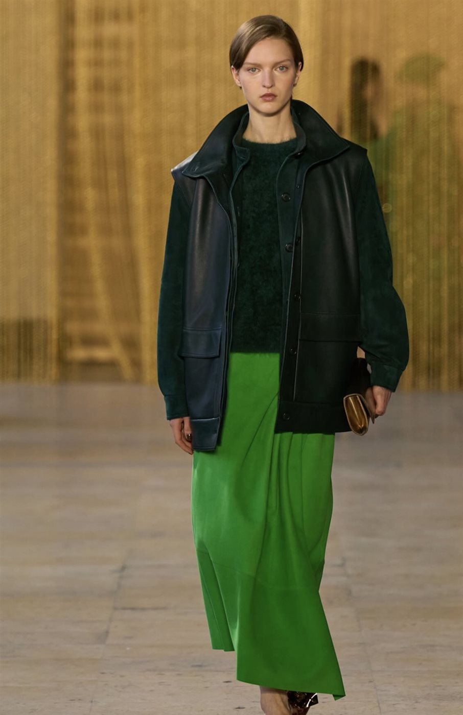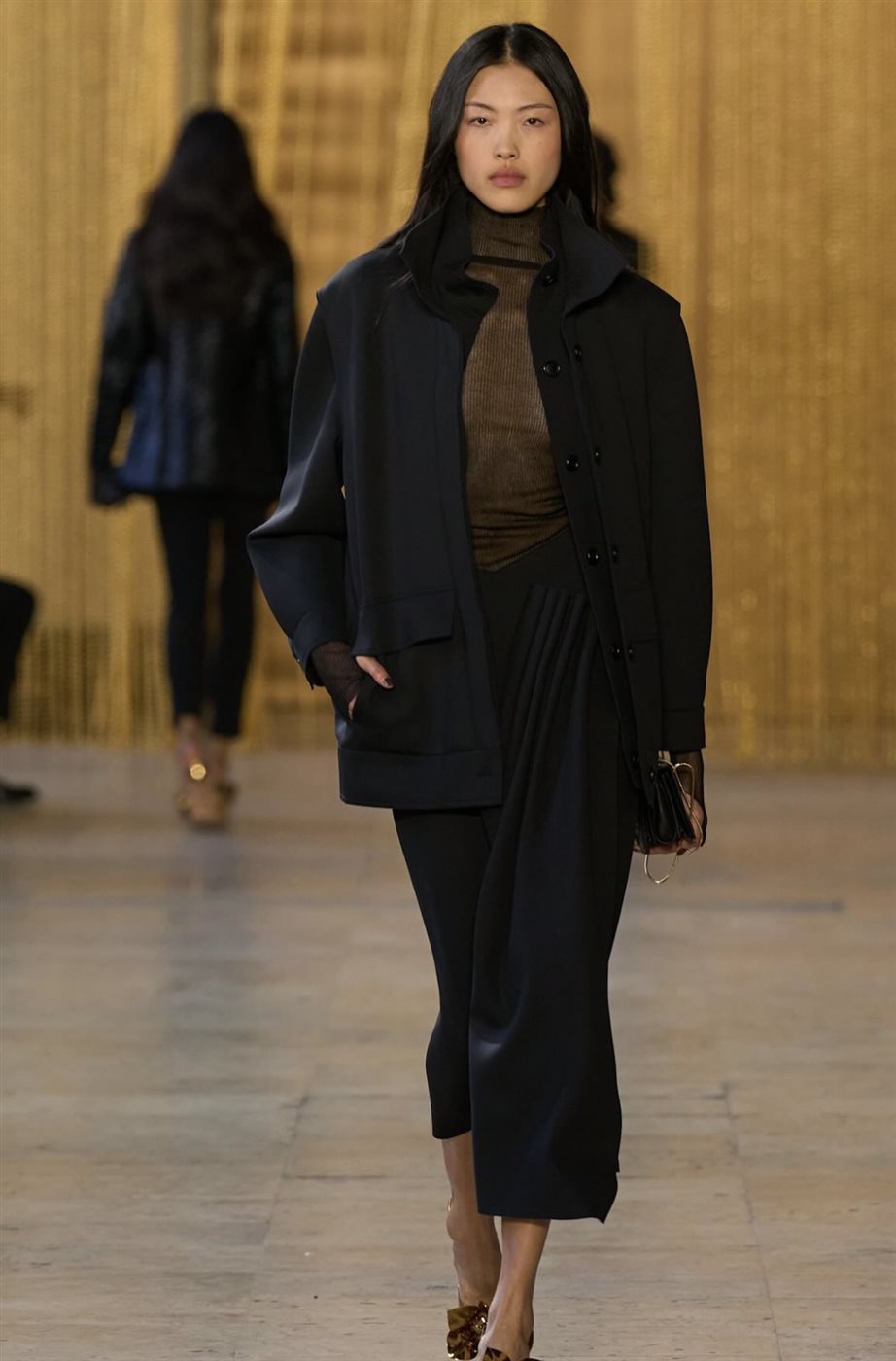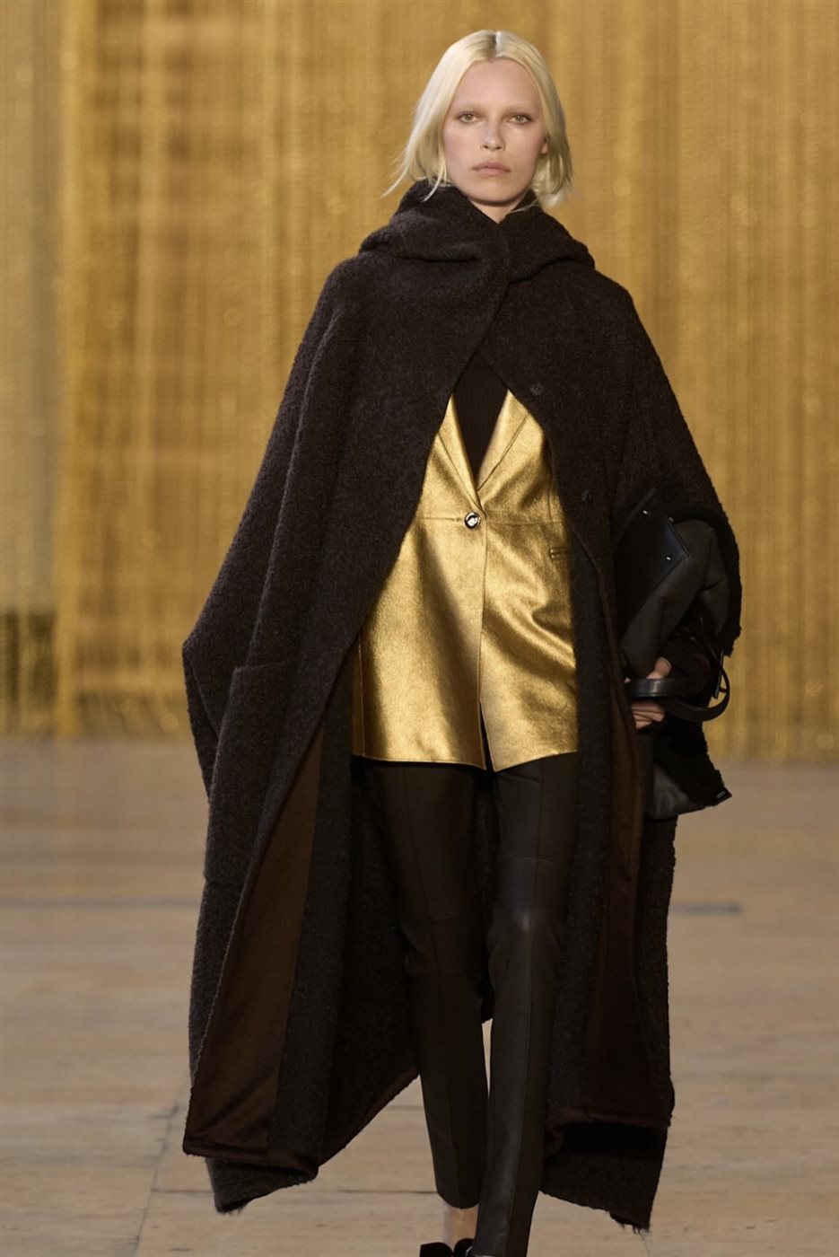 كما لعبت الطبقات دورًا أساسيًا في تشكيل ملامح المجموعة، إذ اعتمد المصمم على تنسيق القطع بطريقة مدروسة تمنح الإطلالات عمقًا بصريًا وأناقة عملية في الوقت نفسه. وظهرت المعاطف الطويلة والبدلات الأنيقة بتفاصيل دقيقة تؤكد اهتمام الدار بالحرفية العالية، فيما جاءت الفساتين بقصّات انسيابية تحافظ على الطابع الكلاسيكي الذي يميز علامة Akris.