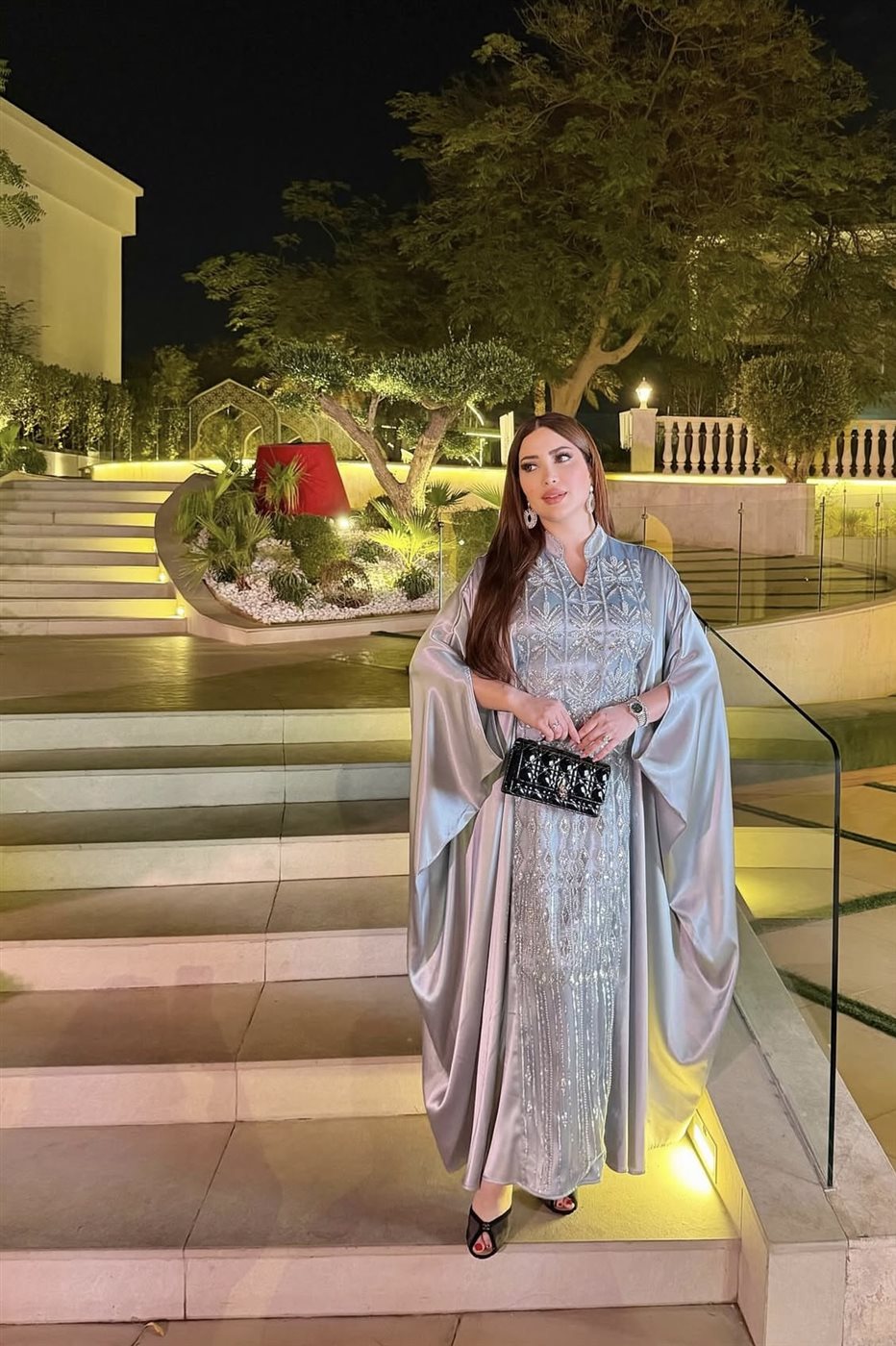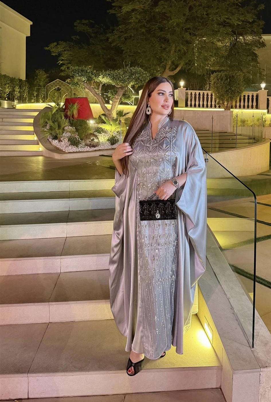 وجاء اختيار اللون الفضي موفقًا، إذ منح الإطلالة طابعًا أنيقًا وهادئًا في الوقت نفسه، كما عكس الضوء بطريقة جذابة جعل التطريزات تبدو أكثر تألقًا تحت الإضاءة الليلية. كما أضفى القماش الساتاني اللامع إحساسًا بالفخامة، ليجعل التصميم مثاليًا للأمسيات والسهرات الرمضانية أو المناسبات الخاصة.